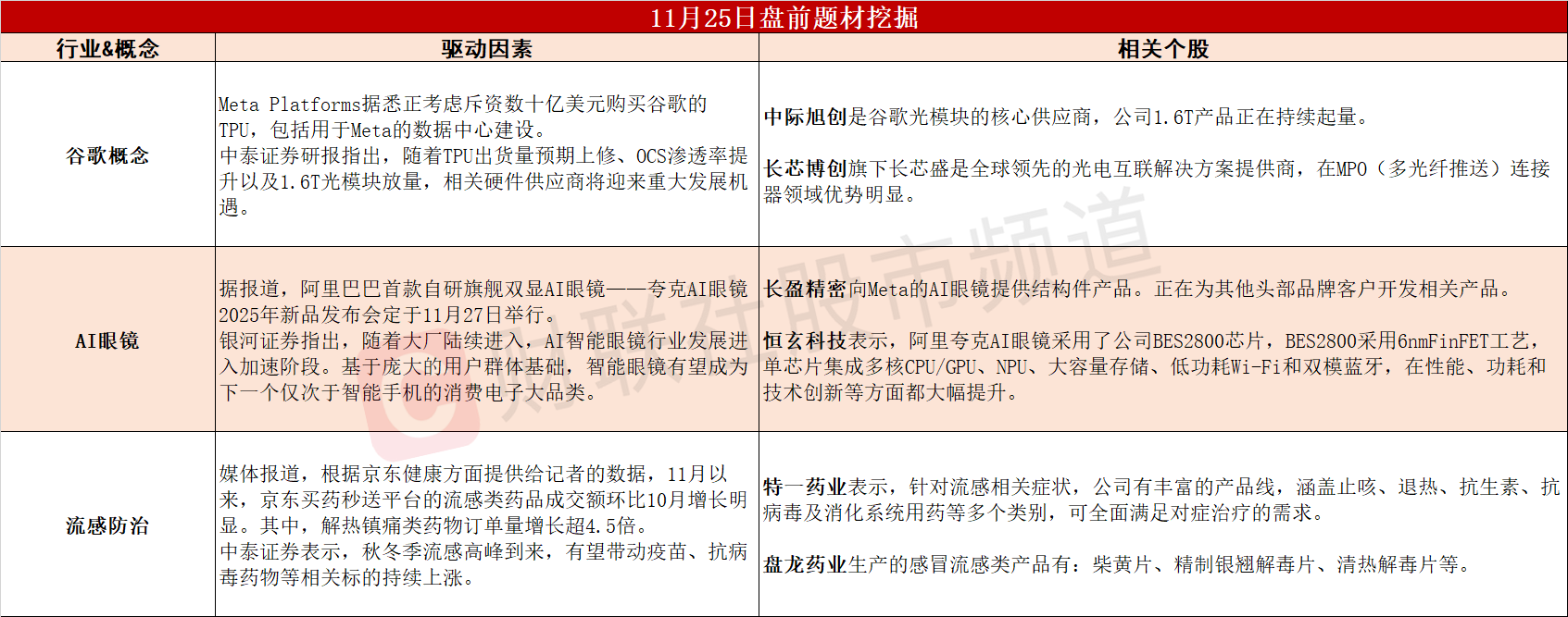 ①Meta斥资数十亿美元购买谷歌TPU,谷歌硬件供应商迎重大机遇。②阿里旗下夸克AI眼镜将举行新品发布会,AI眼镜行业加速发展。③流感类药品订单增长明显,机构称流感高峰带动相关标的持续上涨。