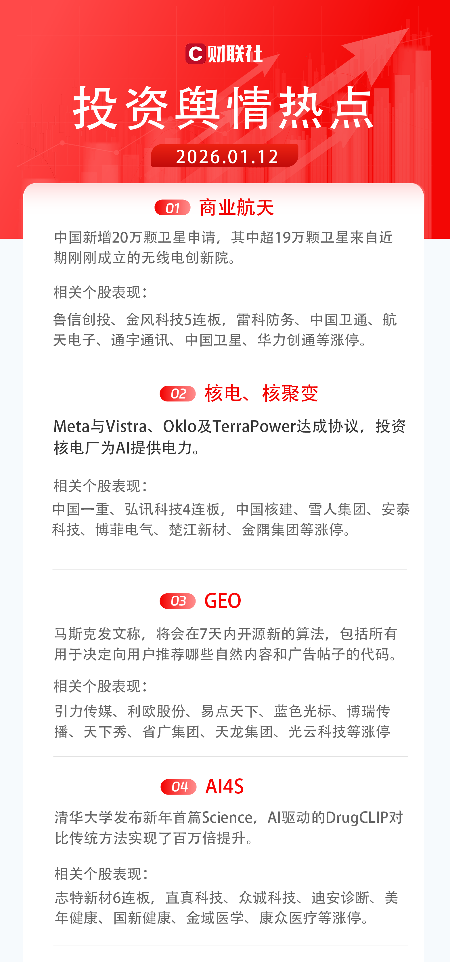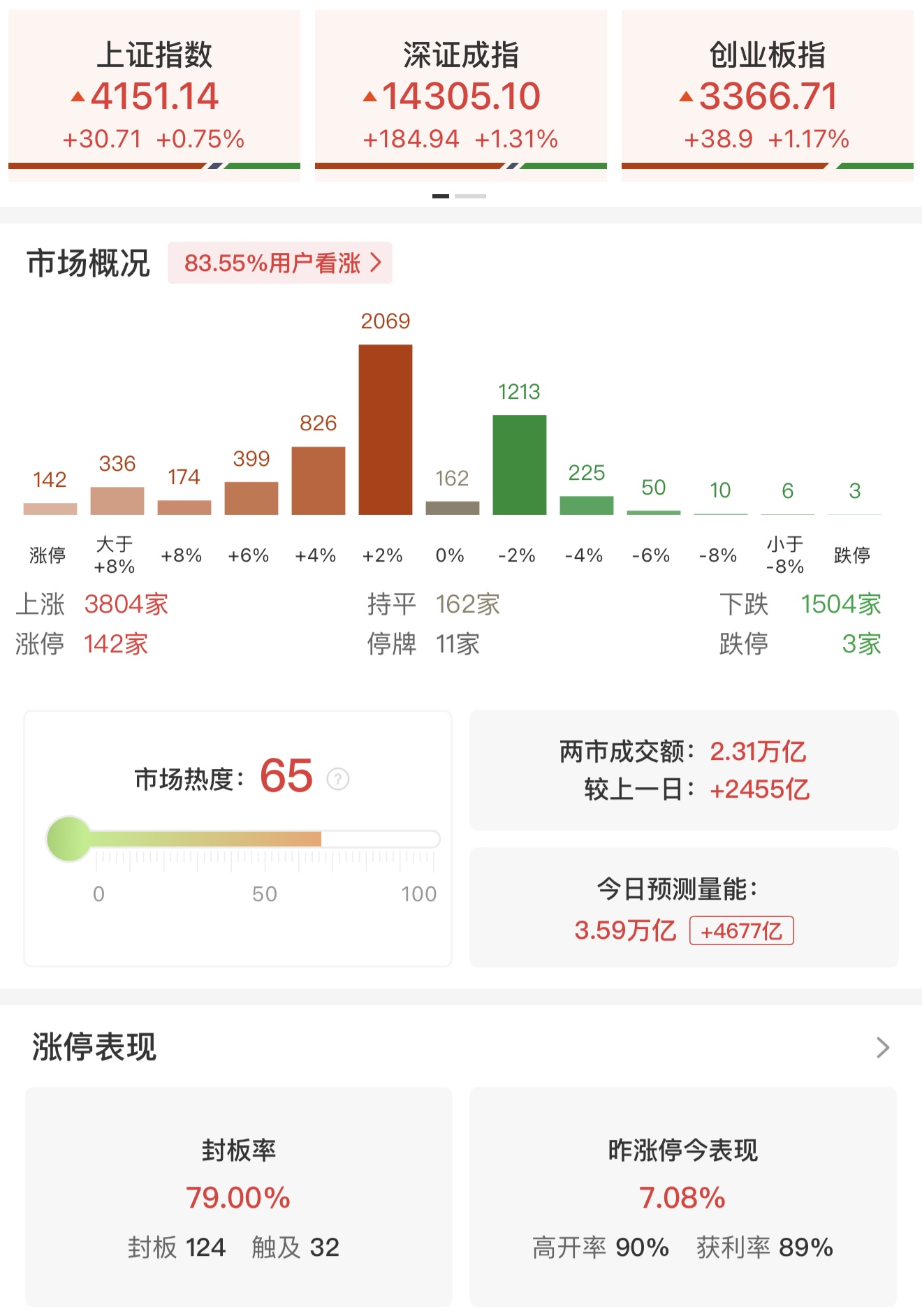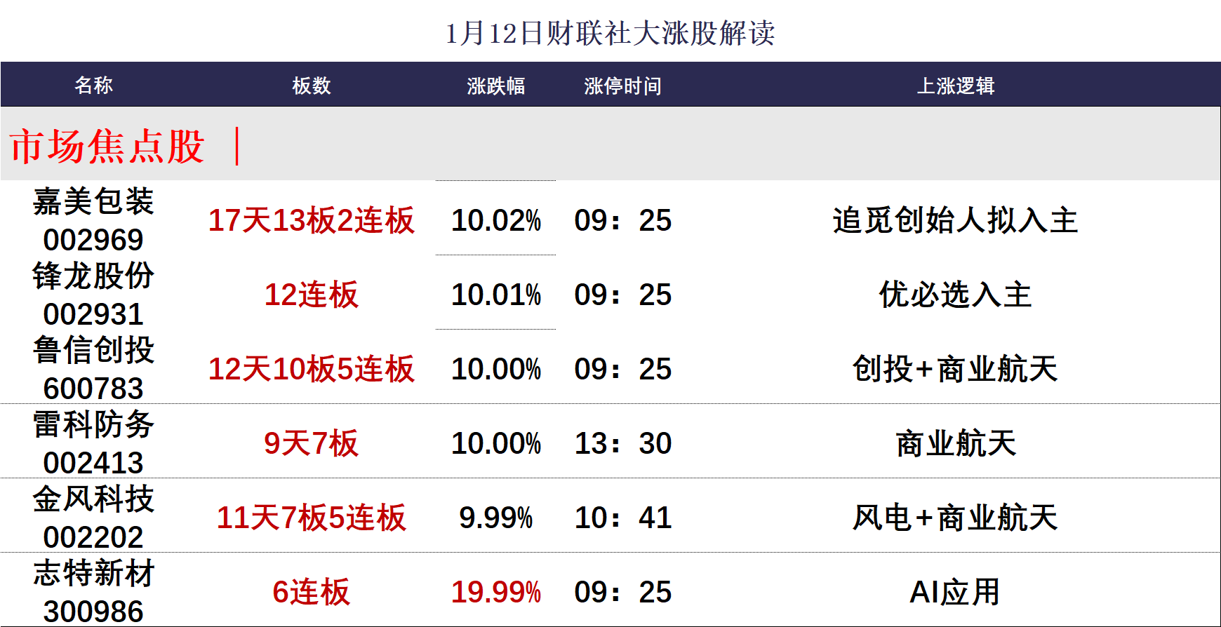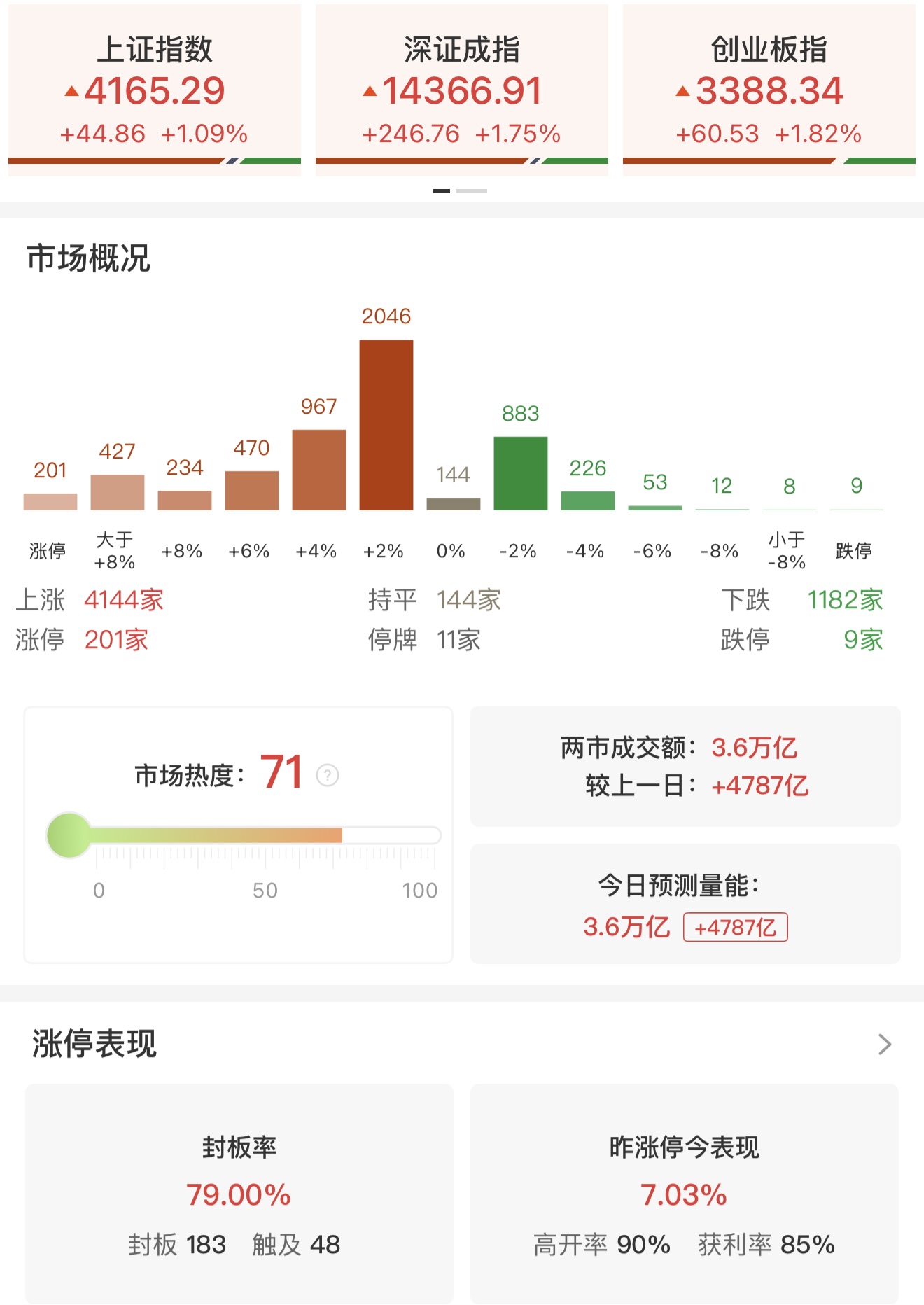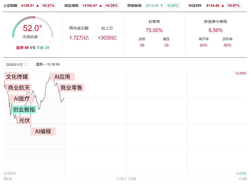 财联社1月12日电,沪指震荡拉升,深成指涨超1%,创业板指探底回升,此前一度跌超1%。量能持续放大,沪深两市半日成交额2.31万亿,较上个交易日放量2455亿。盘面上热点轮番活跃,全市场超3800只个股上涨,其中139只个股涨停。从板块来看,AI应用概念全线爆发,掀起涨停潮,引力传媒6天5板,利欧股份、美年健康、天下秀、省广集团2连板。商业航天概念延续强势,鲁信创投12天10板,金风科技5连板,通宇通讯4天3板。光伏概念表现活跃,东方日升触及20cm涨停。零售概念走高,茂业商业2连板,三江购物、家家悦涨停。下跌方面,油气、煤炭等方向跌幅居前。截至收盘,沪指涨0.75%,深成指涨1.31%,创业板指涨1.17%。