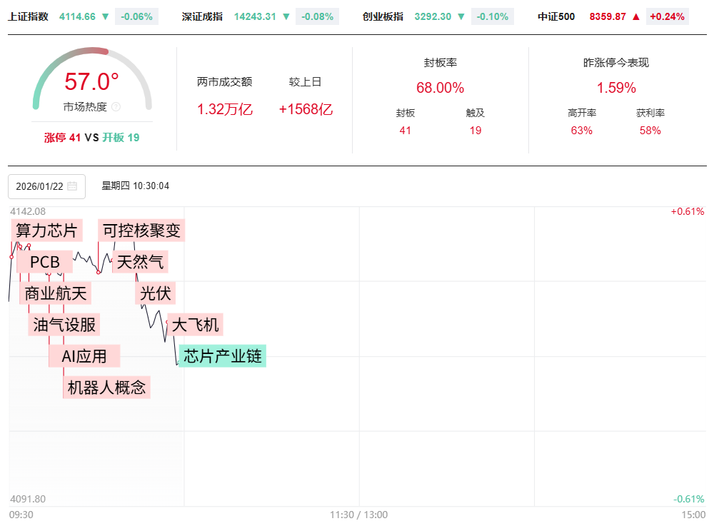财联社1月22日电,市场早盘冲高回落,三大指数集体翻绿,创业板指此前一度涨超1%。沪深两市半日成交额1.77万亿,较上个交易日放量1426亿。盘面上热点快速轮动,全市场超3200只个股上涨。从板块来看,商业航天概念持续回暖,十余只成分股涨停,巨力索具2连板,中超控股、西部材料涨停。油气概念延续强势,洲际油气触及涨停。煤炭板块快速拉升,大有能源直线涨停。机器人概念反复走强,福莱新材、毅昌科技涨停。下跌方面,贵金属概念冲高回落,西部黄金、晓程科技均跌超5%。截至收盘,沪指跌0.15%,深成指跌0.17%,创业板指跌0.4%。
