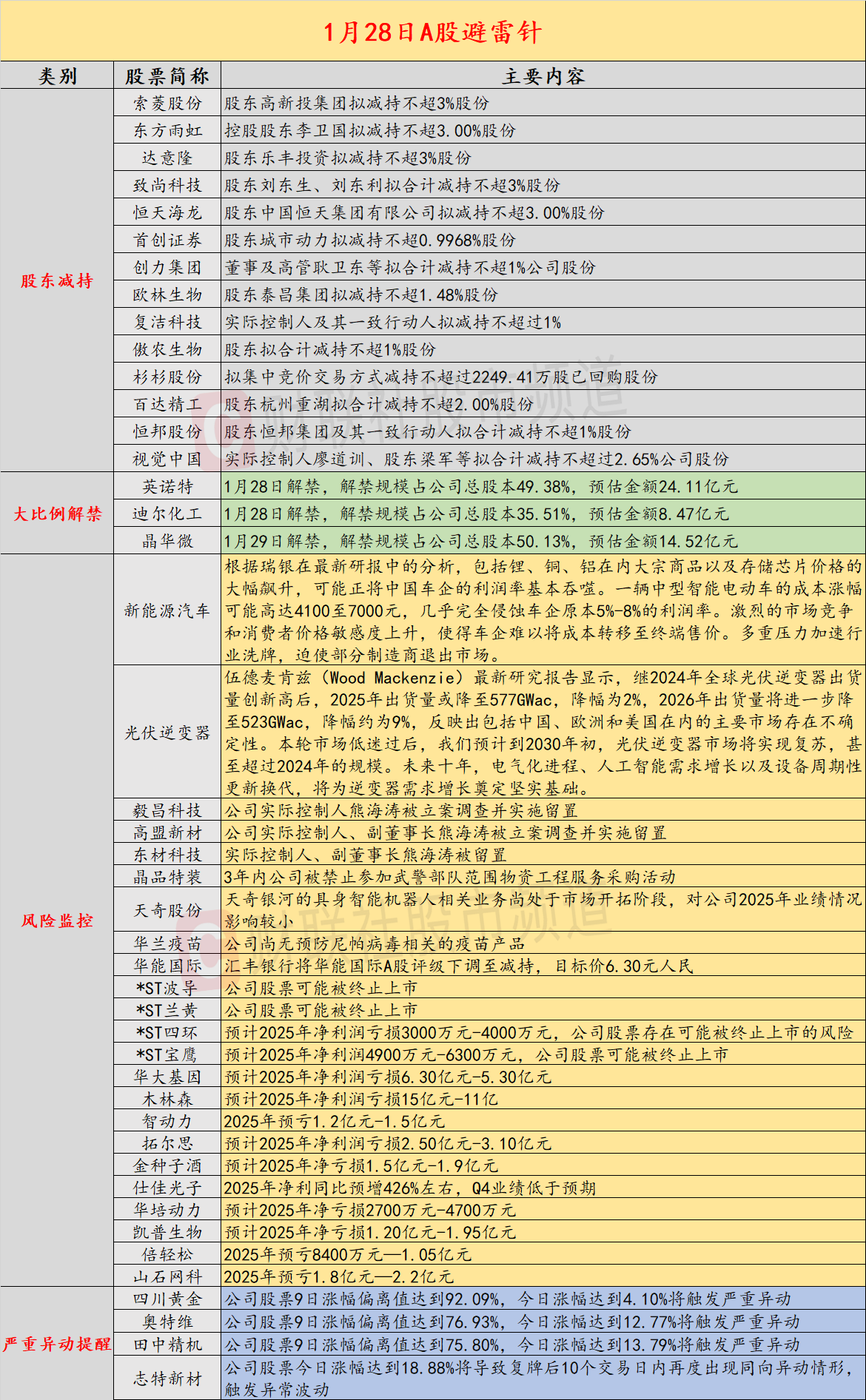 昨日公告的A股拟减持的公司数量较之前有所增多,索菱股份股东高新投集团拟减持不超3%股份,东方雨虹控股股东李卫国拟减持不超3.00%股份;英诺特、迪尔化工将迎来超三成以上解禁;锂、铜、铝及存储芯片价格飙升,正将中国车企利润率基本吞噬;东材科技实际控制人、副董事长熊海涛被留置;大批中成药将被淘汰;晶品特装公告,3年内公司被禁止参加武警部队范围物资工程服务采购活动;机构预计2026年全球光伏逆变器出货量将持续下滑。