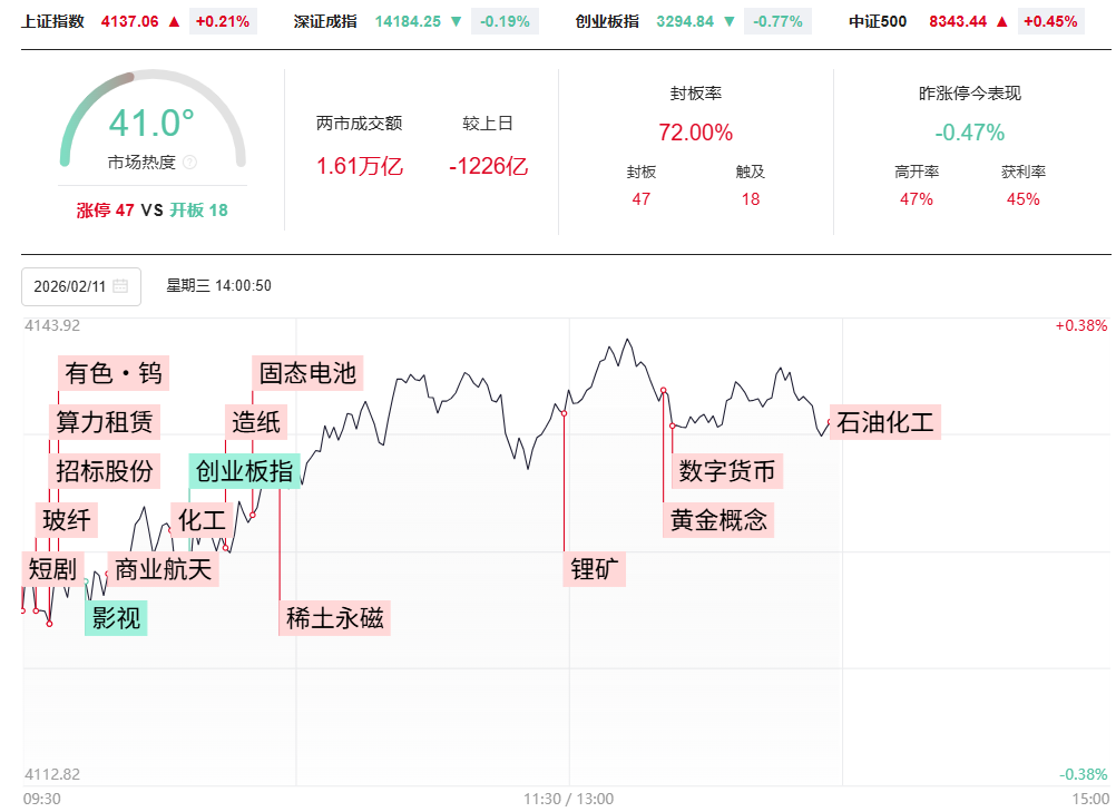 财联社2月11日电,三大指数涨跌不一,沪指震荡拉升,创业板指走势较弱。沪深两市半日成交额1.3万亿,较上个交易日缩量949亿。全市场超2700只个股上涨。从板块来看,化工板块近期反复走强,吉华集团5天4板,三房巷、百川股份、醋化股份、华尔泰涨停。玻纤概念快速拉升,山东玻纤、国际复材、中国巨石涨停。有色金属板块表现活跃,有色·钨概念领涨,翔鹭钨业4天2板,章源钨业涨停。算力租赁概念拉升,南兴股份、大位科技涨停。下跌方面,影视院线概念遭重挫,横店影视跌停,华谊兄弟、华策影视、中国电影大跌。截至收盘,沪指涨0.22%,深成指跌0.07%,创业板指跌0.91%。