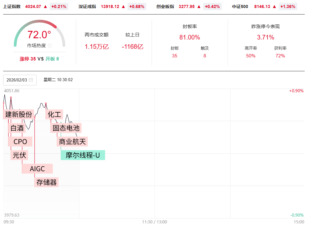财联社2月3日电,市场早盘冲高回落后,又再度震荡拉升。三大指数盘中翻绿,创业板指此前一度涨超2%。沪深两市半日成交额1.6万亿,较上个交易日缩量385亿。盘面上热点较为杂乱,全市场超4400只个股上涨。从板块来看,商业航天概念爆发,十余只成分股涨停,巨力索具、通宇通讯、神剑股份、中超控股涨停。光伏概念持续走强,双良节能、奥特维涨停。化工板块拉升,红宝丽3天2板,万丰股份4连板。AI应用概念反复活跃,浙文互联11天5板。下跌方面,有色金属板块再度下挫,贵金属概念领跌,四川黄金、招金黄金等多股跌停。截至收盘,沪指涨0.38%,深成指涨0.93%,创业板指涨0.76%。