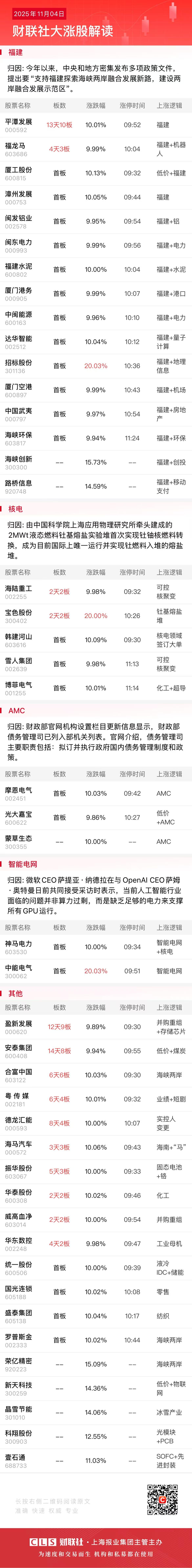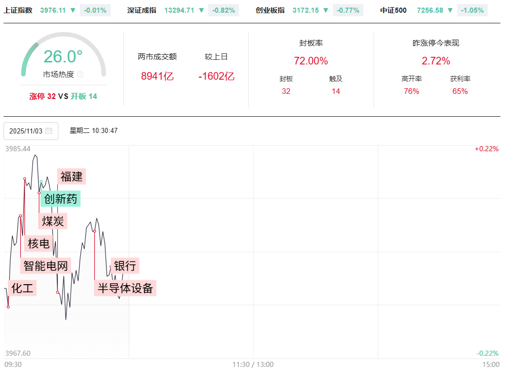 财联社11月4日电,市场早盘震荡调整,深成指、创业板指均跌超1%。沪深两市半日成交额1.22万亿,较上个交易日缩量1648亿。盘面上热点较为杂乱,全市场超3700只个股下跌。从板块来看,福建板块逆势上扬,平潭发展13天10板,福龙马等10股涨停。半导体设备股震荡反弹,中微公司涨超7%。煤炭板块反复活跃,安泰集团14天8板。下跌方面,机器人概念股集体下跌,安培龙、拓普集团等多股大跌。创新药概念震荡调整,常山药业一度逼近跌停。黄金概念股多股下挫,潮宏基持续走弱。板块方面,银行、福建自贸区、电网设备等板块涨幅居前,贵金属、医药、机器人等板块跌幅居前。截至收盘,沪指跌0.19%,深成指跌1.27%,创业板指跌1.51%。