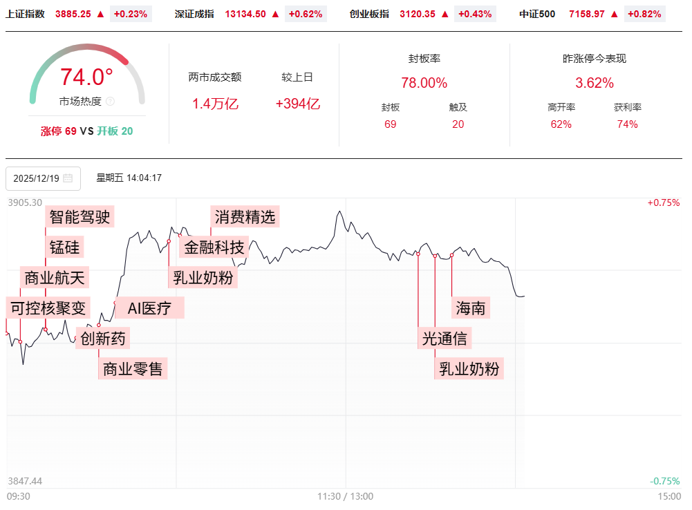 财联社12月19日电,沪指震荡回升,创业板指冲高回落,此前一度涨超1.5%。东百集团、平潭发展、海峡创新等多只高位股尾盘跳水。沪深两市成交额1.73万亿,较上一个交易日放量704亿。盘面上,市场热点快速轮动,全市场近4500只个股上涨。从板块来看,海南板块午后快速拉升,海南海药、海汽集团双双涨停。大消费板块全天走强,零售、乳业方向领涨,上海九百、庄园牧场等多股涨停。商业航天概念延续强势,华体科技、西部材料均2连板。智能驾驶概念走强,浙江世宝4连板。路畅科技4天2板。可控核聚变概念表现强势,王子新材3天2板。下跌方面,存储芯片概念集体下挫,神工股份、德明利大跌。板块方面,海南、乳业、零售等板块涨幅居前,贵金属、半导体等板块跌幅居前。截至收盘,沪指涨0.36%,深成指涨0.66%,创业板指涨0.49%。