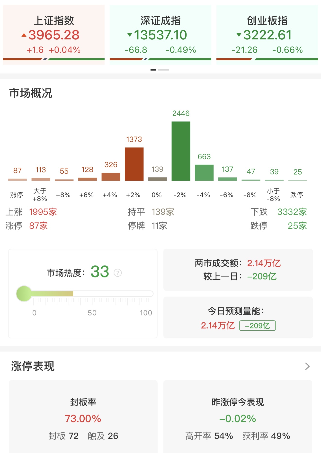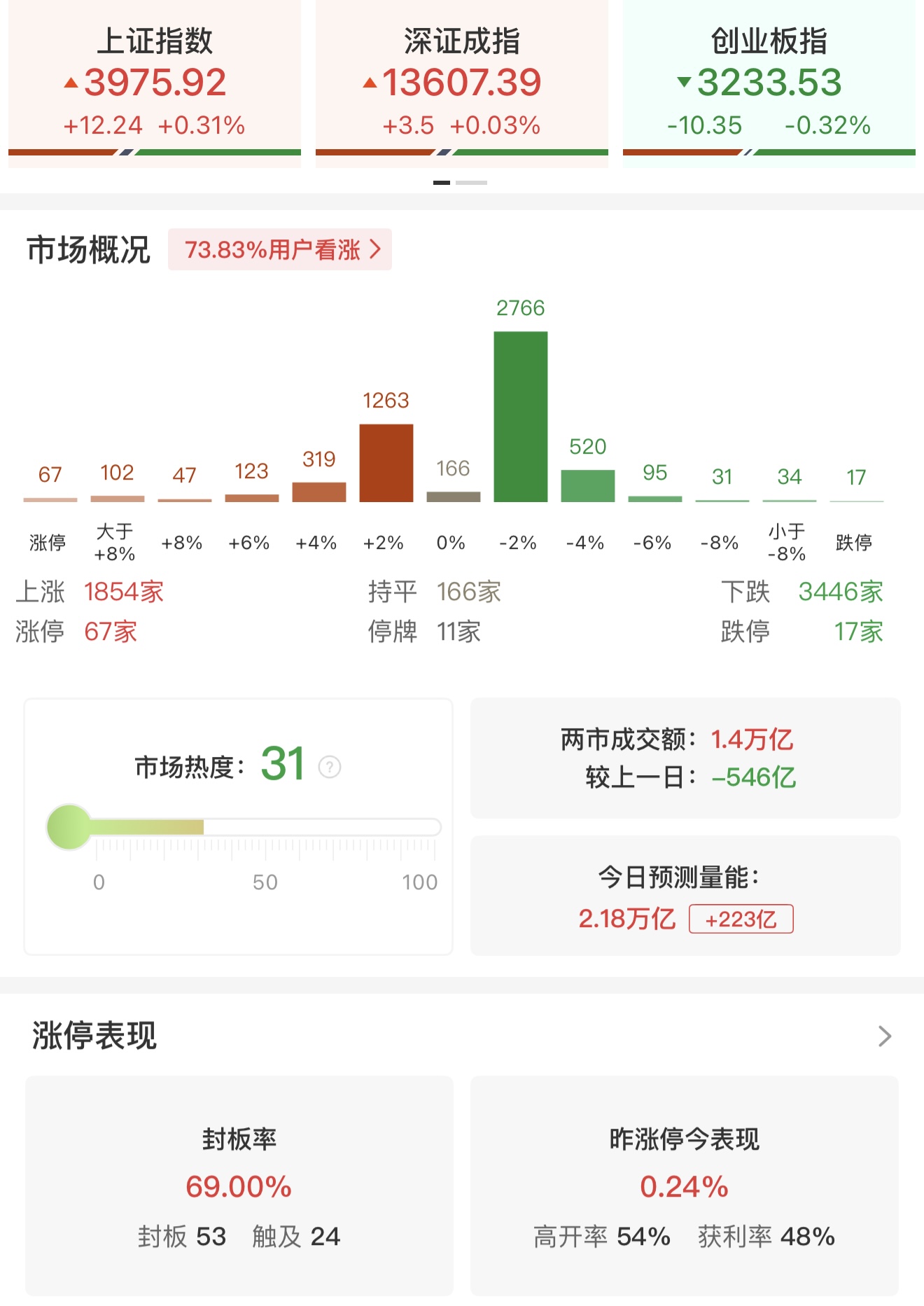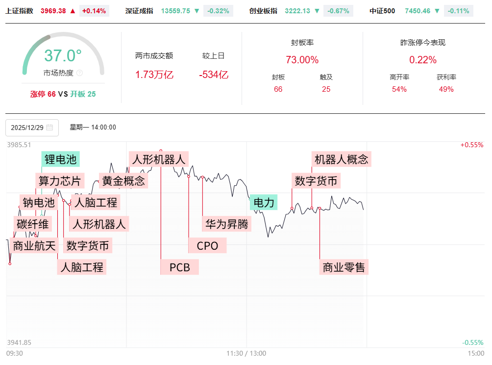 财联社12月29日电,早盘三大指数涨跌不一,沪指震荡上扬,创业板指翻红后再度回落。沪深两市半日成交额1.4万亿,较上个交易日缩量546亿。盘面上热点快速轮动,全市场超3400只个股下跌。从板块来看,商业航天概念延续强势,10余只成分股涨停,神剑股份8连板,金风科技、雷科防务涨停。机器人概念反复活跃,锋龙股份4连板,五洲新春、模塑科技等多股涨停。贵金属板块持续走强,白银有色、湖南白银双双涨停。碳纤维概念表现活跃,吉林化纤涨停。下跌方面,大消费板块下挫,零售、乳业概念跌幅居前,百大集团跌停,皇氏集团大跌。截至收盘,沪指涨0.31%,深成指涨0.03%,创业板指跌0.32%。