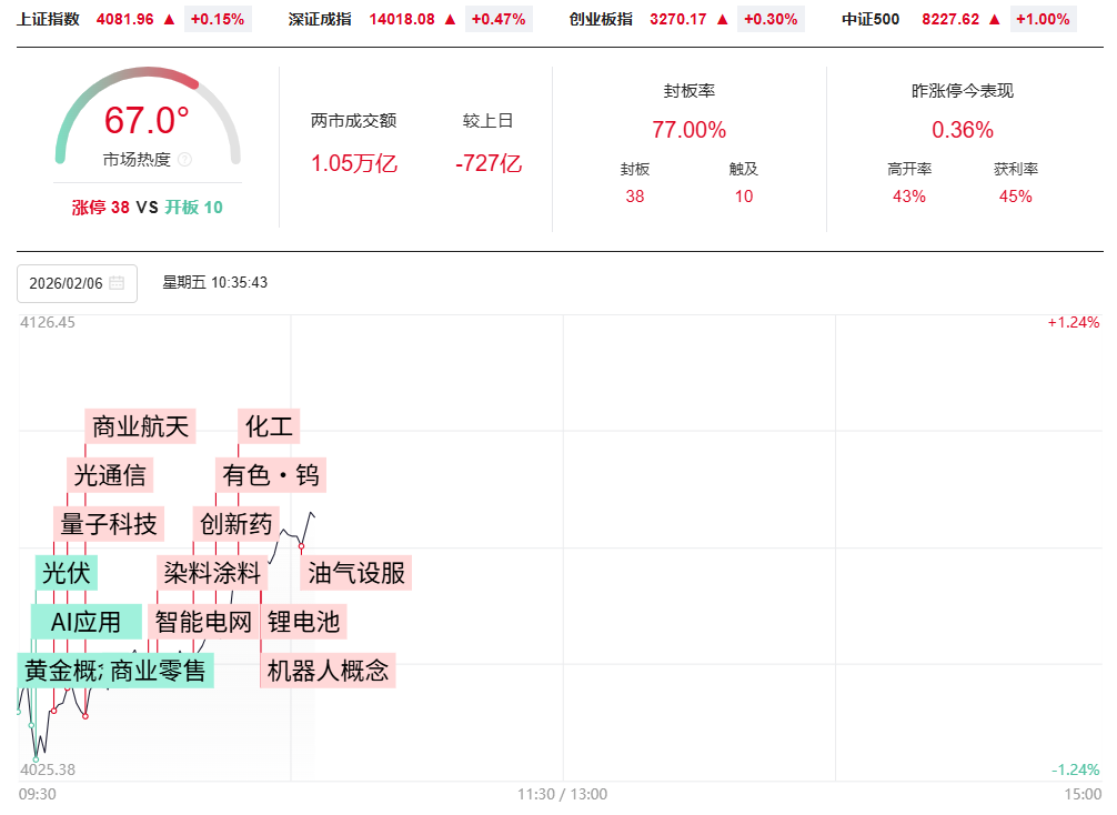 财联社2月6日电,指数低开回升,沪指、深成指双双翻红,此前均跌超1%。中药、化工、电网、量子科技等方向涨幅居前,沪深京三市上涨个股近3700只。