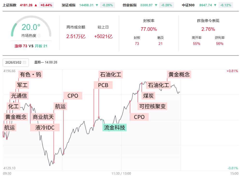财联社3月2日电,市场早盘集体低开,创业板指、深成指盘中均跌超1%,微盘股指数跌超2%。量能快速放大,两市成交额半日突破2万亿,较上个交易日放量4872亿。全市场超4300只个股下跌。从板块来看,油气股逆势爆发,十余只成分股涨停,洲际油气5天3板,中曼石油、准油股份、山东墨龙涨停。化工板块反复活跃,金牛化工走出11天5板,金瑞矿业、红星发展、兴化股份涨停。PCB概念震荡回升,民爆光电触及20cm涨停。CPO概念逆势拉升,凯格精机20cm涨停。下跌方面,光伏设备概念集体下挫,双良节能一字跌停。截至收盘,沪指翻红,深成指跌0.75%,创业板指跌0.78%。