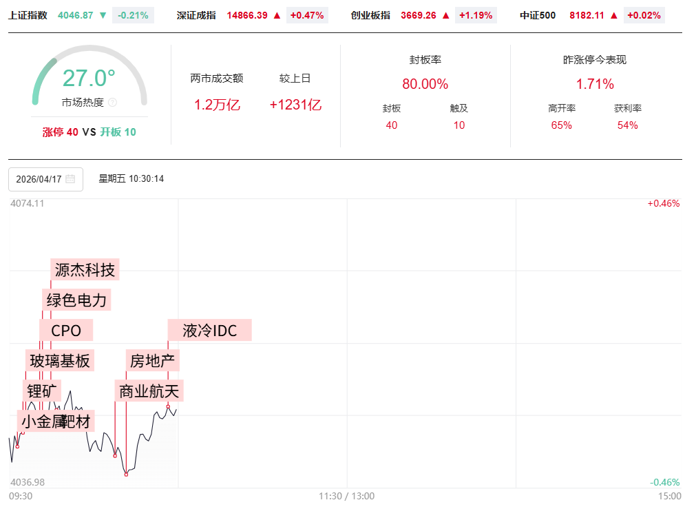 财联社4月17日电,沪指低开0.30%,深成指高开0.07%,创业板指高开0.47%。CPO、煤炭等板块指数涨幅居前,玻纤、贵金属等板块指数跌幅居前。