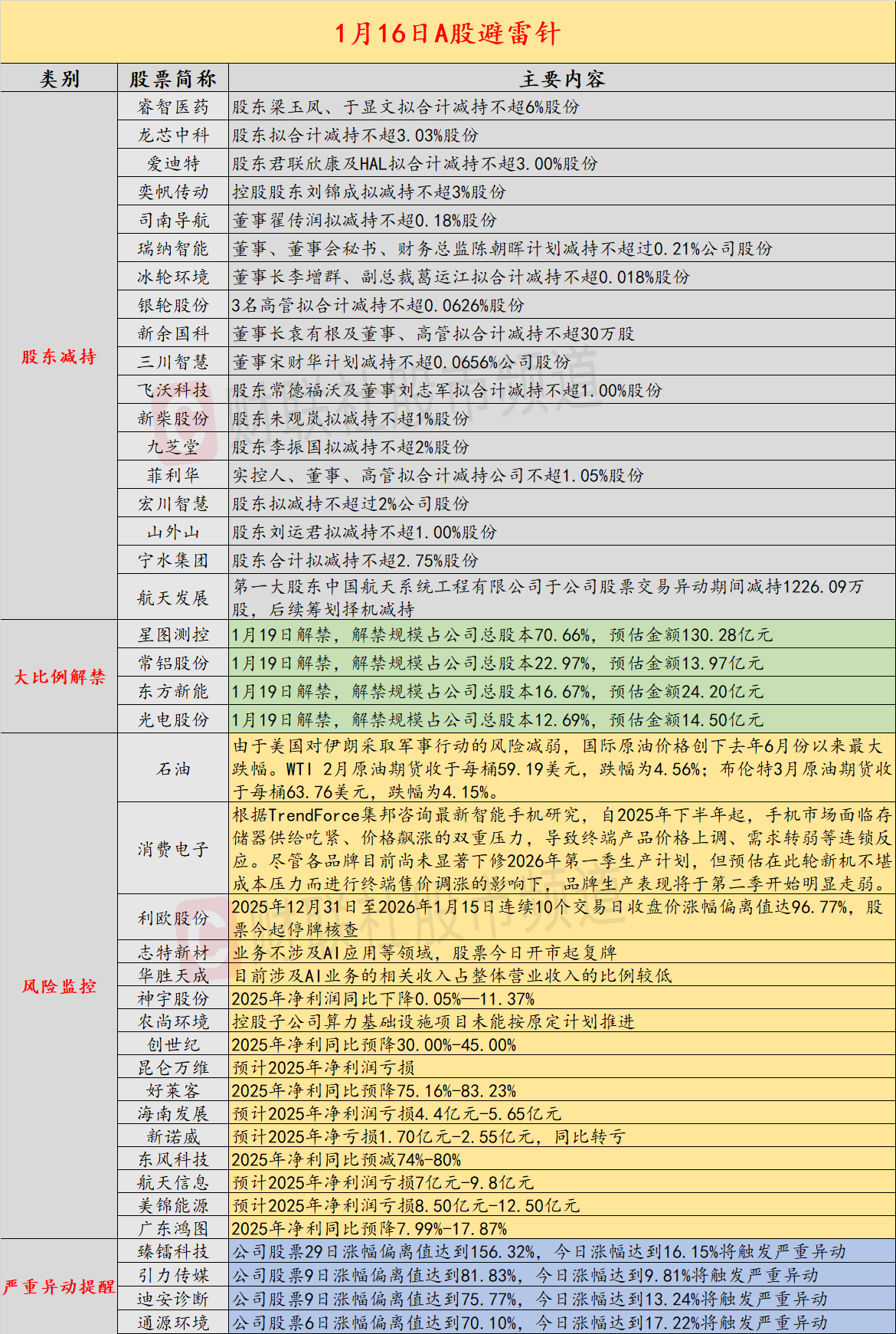 昨日公告的A股拟减持的公司数量较之前有所增多,睿智医药股东梁玉凤、于显文拟合计减持不超6%股份,龙芯中科股东拟合计减持不超3.03%股份;星图测控、常铝股份将迎来超二成以上解禁;新机调价影响销售需求,2026年第二季度起智能手机生产承压明显;利欧股份2025年12月31日至2026年1月15日连续10个交易日收盘价涨幅偏离值达96.77%,股票今起停牌核查;BBA在华销量跌回七八年前;20CM六连板志特新材表示业务不涉及AI应用等领域,股票今日开市起复牌;国际油价15日显著下跌。