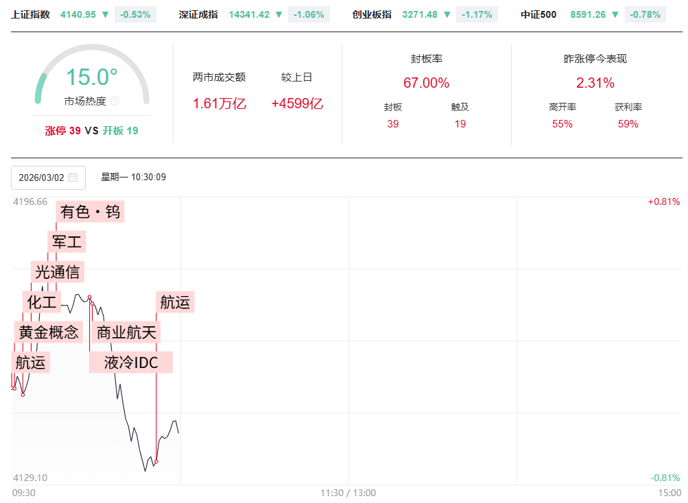 财联社3月2日电,市场早盘集体低开,创业板指、深成指盘中均跌超1%,微盘股指数跌超2%。量能快速放大,两市成交额半日突破2万亿,较上个交易日放量4872亿。全市场超4300只个股下跌。从板块来看,油气股逆势爆发,十余只成分股涨停,洲际油气5天3板,中曼石油、准油股份、山东墨龙涨停。化工板块反复活跃,金牛化工走出11天5板,金瑞矿业、红星发展、兴化股份涨停。PCB概念震荡回升,民爆光电触及20cm涨停。CPO概念逆势拉升,凯格精机20cm涨停。下跌方面,光伏设备概念集体下挫,双良节能一字跌停。截至收盘,沪指翻红,深成指跌0.75%,创业板指跌0.78%。