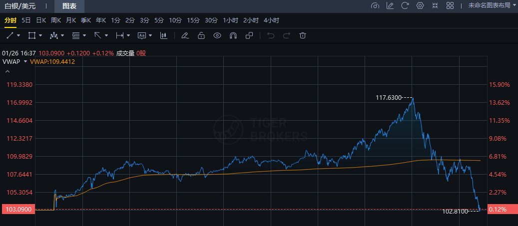 1、黄金与白银在刷新历史高点后大幅回调。现货白银一度上涨14%,达117美元/盎司,随后跳水并抹去全部日内涨幅,收报约103.7美元/盎司。现货黄金一度上涨2.5%,达5110美元/盎司,随后回落至5010美元/盎司附近。