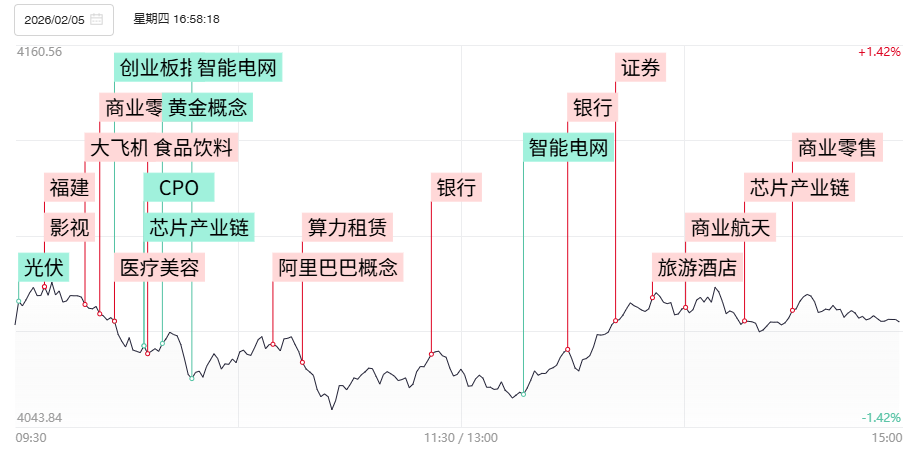 财联社2月6日电,上个交易日三大指数午后跌幅收窄,此前一度跌超1%,北证50指数跌超2%。全市场超3700只个股下跌。沪深两市成交额2.18万亿,较前日缩量3048亿。1)日前商务部等9单位关于印发《2026“乐购新春”春节特别活动方案》的通知,春节消费旺季大幕拉开。影视板块卷土重来,横店影视走出反包板,幸福蓝海、金逸影视、光线传媒等纷纷走高。零售、旅游等消费板块涨势持续扩大,零售股杭州解百、新华都、三江购物以及旅游股三峡旅游等纷纷涨停。2)随着此前谷歌、亚马逊等北美头部云服务商先后上调CDN服务费率后,国内云服务厂商的涨价何时落地备受市场关注。算力租赁概念结束调整卷土重来,群兴玩具、二六三反包涨停,利通电子、网宿科技、南凌科技、天威视讯等纷纷展开像样反弹。3)上交所最新数据显示,2026年1月,新增投资者开户数达491.58万户,环比2025年12月大增89%、同比飙升213%。大金融板块午后强势崛起,华林证券封涨停,华鑫股份、赢时胜、银之杰等一度大幅冲高。4)美国联邦通信委员会(FCC)美东时间2月4日接受SpaceX公司提出的建造非地球静止轨道卫星系统的申请并进行公示。商业航天概念午后持续回暖,神剑股份、北摩高科封涨停,巨力索具、雷科防务、西部材料等前期人气股逆势走强。不过此前持续表现火爆的太空光伏概念表现降温。钧达股份、宇晶股份等10厘米人气股跌停,捷佳伟创、连城数控、迈为股份等趋势抱团股均跌超10%。