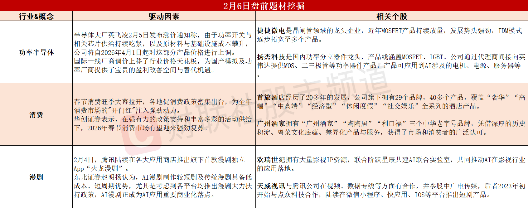①功率半导体巨头英飞凌宣布涨价,国产厂商有望迎来盈利改善空间。②春节消费旺季大幕拉开,机构称消费市场或迎强劲复苏。③腾讯推出“火龙漫剧”平台,AI漫剧有望成为AI应用最佳商业化落点。