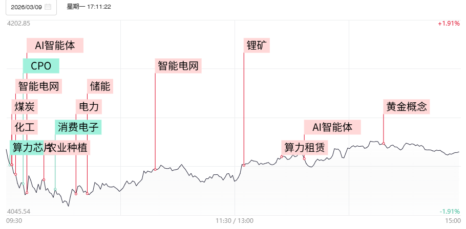 财联社3月9日电,三大指数集体调整,沪指跌超1%,创业板指、深成指半日跌超2%。沪深两市半日成交额1.79万亿,较上个交易日放量4031亿。盘面上热点较为杂乱,全市场超4500只个股下跌。从板块来看,电网设备概念逆势走强,国电南自、三变科技涨停,双双创历史新高。OpenClaw概念逆势上涨,优刻得20cm涨停,宁波建工2连板。油气股表现活跃,中国海油触及涨停。下跌方面,算力硬件概念集体下挫,罗博特科、光库科技、源杰科技大跌。截至收盘,沪指跌1.13%,深成指跌2.14%,创业板指跌2.42%。