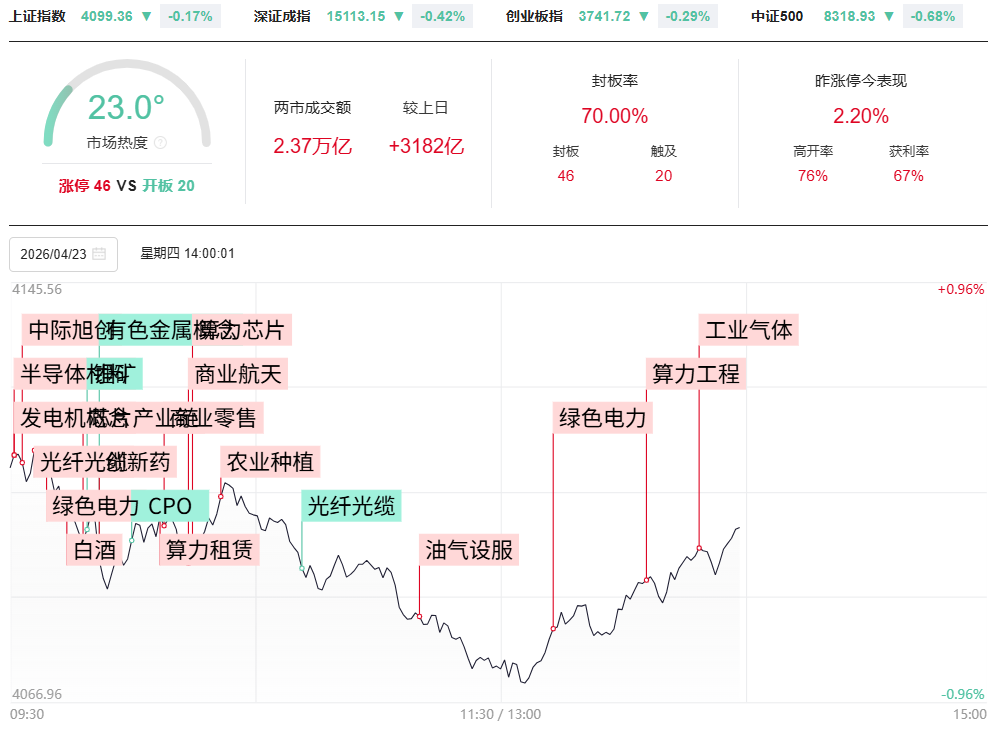 财联社4月23日电,市场早盘高开低走,深成指、创业板指均跌超1.5%。中际旭创盘中总市值站上万亿。沪深两市半日成交额1.95万亿,较上个交易日放量3673亿。盘面上热点较为杂乱,全市场超4300只个股下跌。从板块来看,防御性板块走强,其中大消费板块表现活跃,白酒、零售概念异动拉升,迎驾贡酒、中兴商业涨停。银行板块震荡拉升,贵阳银行涨超7%。油气概念快速走高,山东墨龙涨停。燃气轮机概念表现活跃,福鞍股份一字涨停,应流股份触及涨停创历史新高。下跌方面,CPO等算力硬件股集体调整,赛微电子、腾景科技、光库科技等多股大跌,华盛昌跌停。截至收盘,沪指跌0.79%,深成指跌1.53%,创业板指跌1.83%。