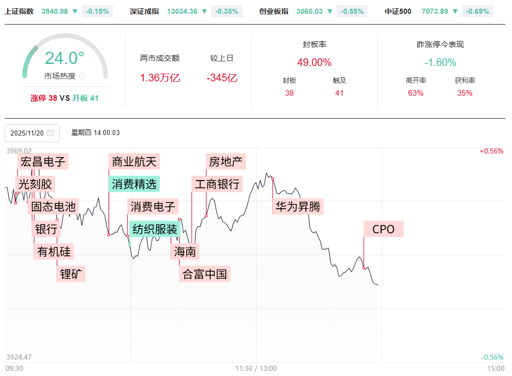 财联社11月20日电,市场早盘高开低走,创业板指跌0.52%,此前一度涨超1.5%。沪深两市半日成交额1.11万亿,较上个交易日放量23亿。全市场超3000只个股下跌。从板块来看,银行板块逆势走强,中国银行、工商银行均续创历史新高。锂电池产业链表现活跃,百川股份等多股涨停。光刻胶概念延续强势,国风新材2连板。下跌方面,旅游酒店、食品、零售、纺织服装等泛消费方向走弱,水羊股份、南京商旅、益客食品等多股大跌。板块方面,能源金属、海南、银行等板块涨幅居前,美容护理、旅游及酒店、食品加工等板块跌幅居前。截至收盘,沪指涨0.38%,深成指跌0.05%,创业板指跌0.52%。