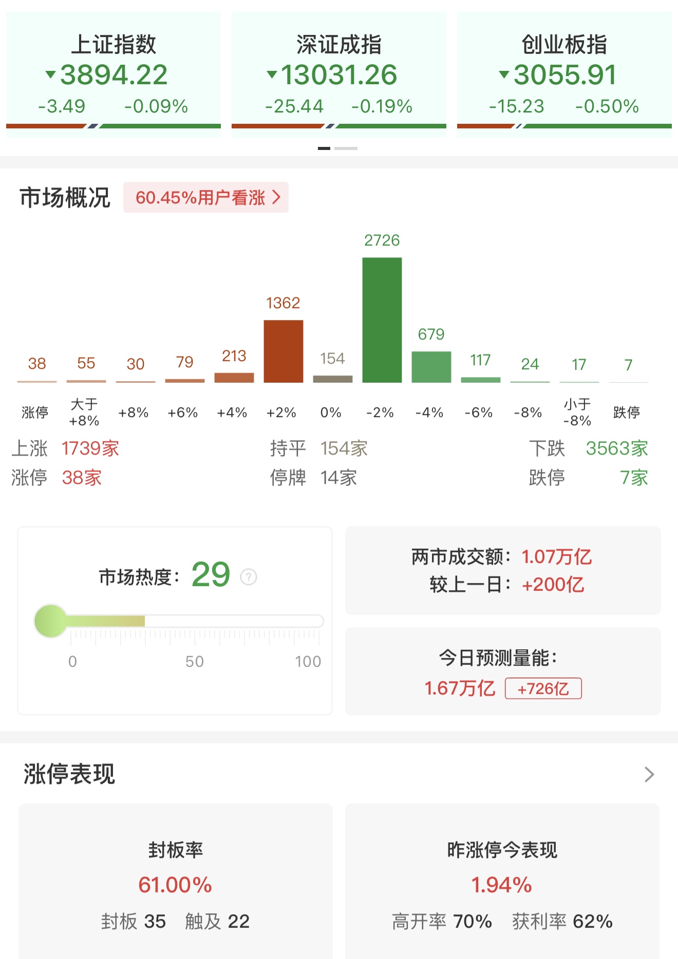 财联社12月3日电,市场早盘震荡调整,创业板指冲高回落,此前一度涨超1%。沪深两市半日成交额1.07万亿,较上个交易日放量200亿。盘面上热点快速轮动,全市场超3500只个股下跌。从板块来看,商业航天概念探底回升,航天动力上演“地天板”,顺灏股份4连板。煤炭板块快速拉升,安泰集团2连板,大有能源、新大洲A涨停。福建板块表现活跃,海欣食品晋级6连板,太阳电缆2连板。超硬材料概念走强,黄河旋风触及涨停。下跌方面,AI应用概念集体走弱,福石控股跌近11%。板块方面,培育钻石、煤炭、海南等板块涨幅居前,AI应用、影视院线等板块跌幅居前。截至收盘,沪指跌0.09%,深成指跌0.19%,创业板指跌0.5%。