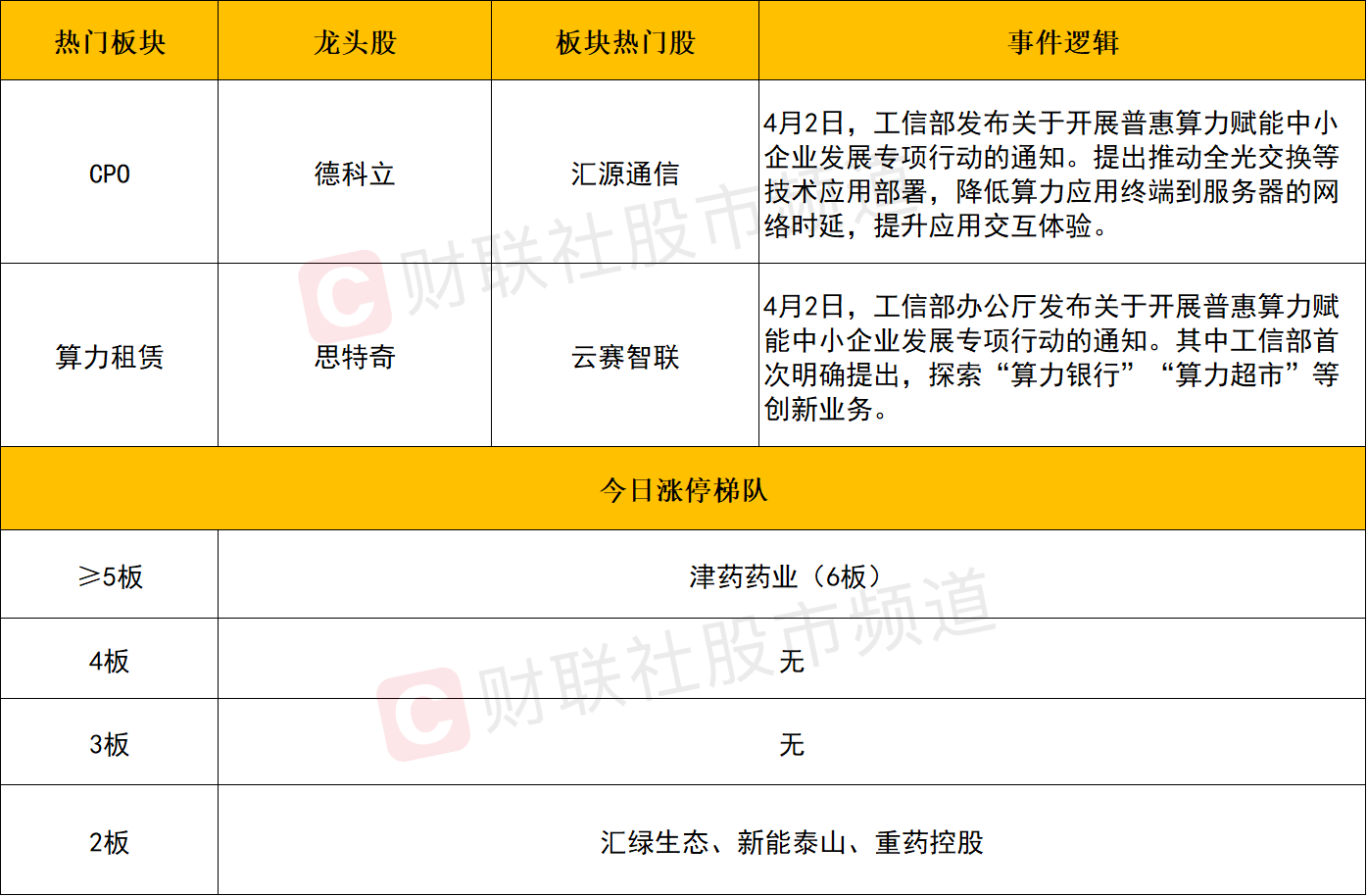 财联社4月3日电,今日全市场共36股涨停,连板股总数4只,12股封板未遂,封板率为75%(不含ST股、退市股)。焦点股方面,光纤概念股新能泰山9天7板,医药板块津药药业6连板。