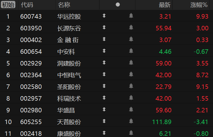 财联社4月14日电,市场焦点股华远控股(5板)高开9.93%,并购重组的长源东谷(4板)高开3.00%、金融街(2板)高开0.33%,算力板块中安科(6天4板)低开0.67%、润建股份(4天2板)高开3.55%,储能板块中恒电气(3板)高开8.72%、圣阳股份(3板)高开9.15%,光通信概念股科瑞技术(5天3板)高开1.55%、华盛昌(6天3板)高开2.21%,算力芯片概念股天普股份(2板)低开3.41%,液冷服务器概念股康盛股份(2板)低开0.80%。
