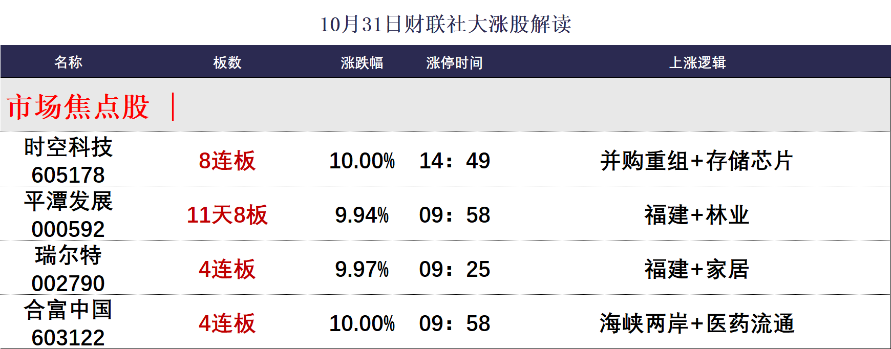 财联社10月31日电,今日全市场共57股涨停,连板股总数9只,37股封板未遂,封板率为60%(不含ST股、退市股)。焦点股方面,并购重组的时空科技晋级8连板,福建本地股平潭发展走出11天8板,瑞尔特与合富中国均录得4连板。