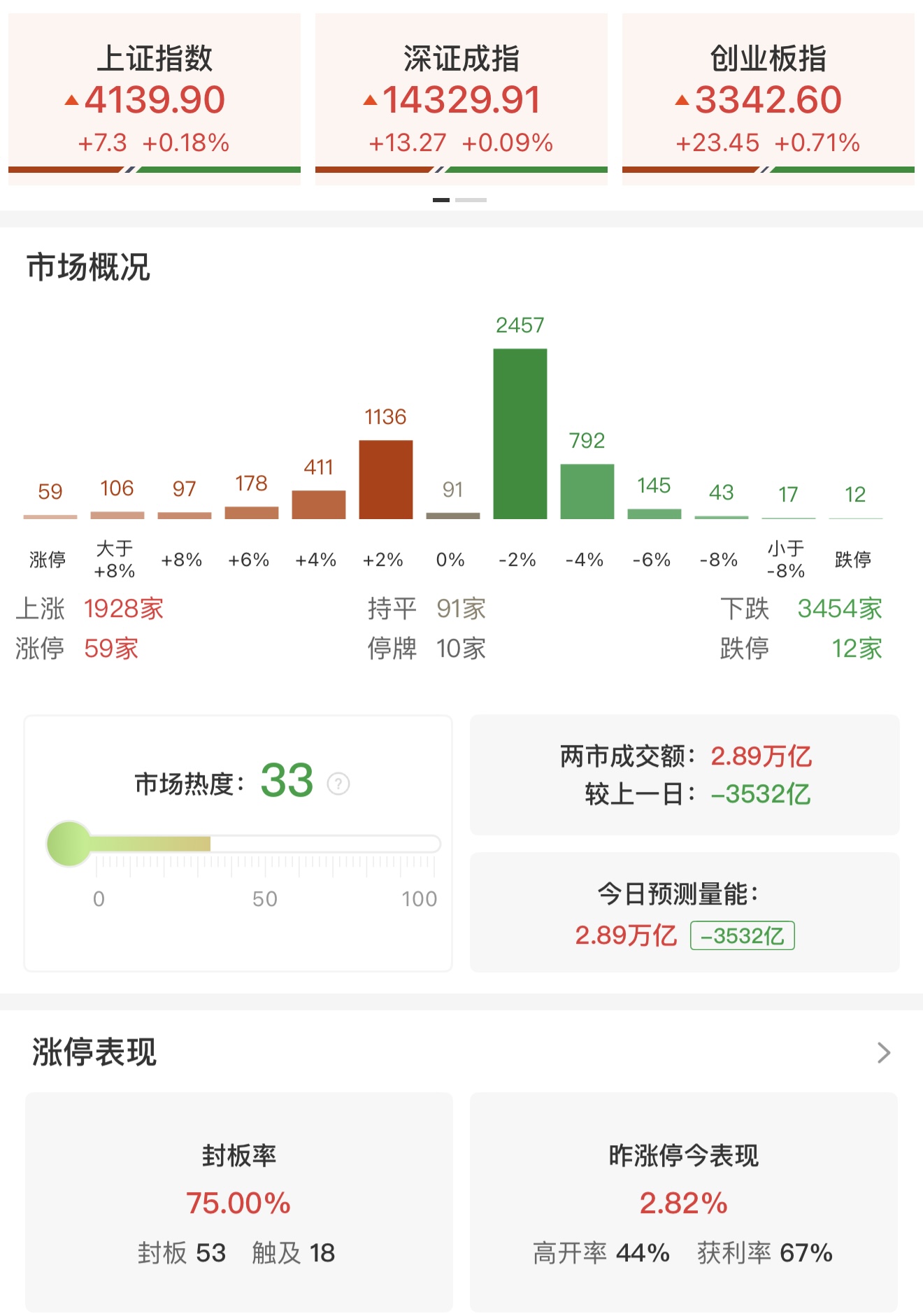 财联社1月27日电,市场探底回升,三大指数集体翻红,创业板指一度涨超1%。沪深两市成交额2.89万亿,较上一个交易日缩量3532亿。盘面上,全市场超3400只个股下跌。从板块来看,芯片产业链持续拉升,华虹公司创历史新高,亚翔集成、圣晖集成、华天科技涨停。贵金属概念延续强势,中国黄金3连板,湖南黄金2连板。CPO概念表现活跃,源杰科技涨超10%创历史新高,汇绿生态涨停。太空光伏概念持续回升,宇晶股份4天3板,赛伍技术3天2板。超硬材料概念走强,黄河旋风涨停。下跌方面,煤炭、电池等板块跌幅居前。其中电池产业链集体下挫,天际股份、华盛锂电跌超6%。截至收盘,沪指涨0.18%,深成指涨0.09%,创业板指涨0.71%。