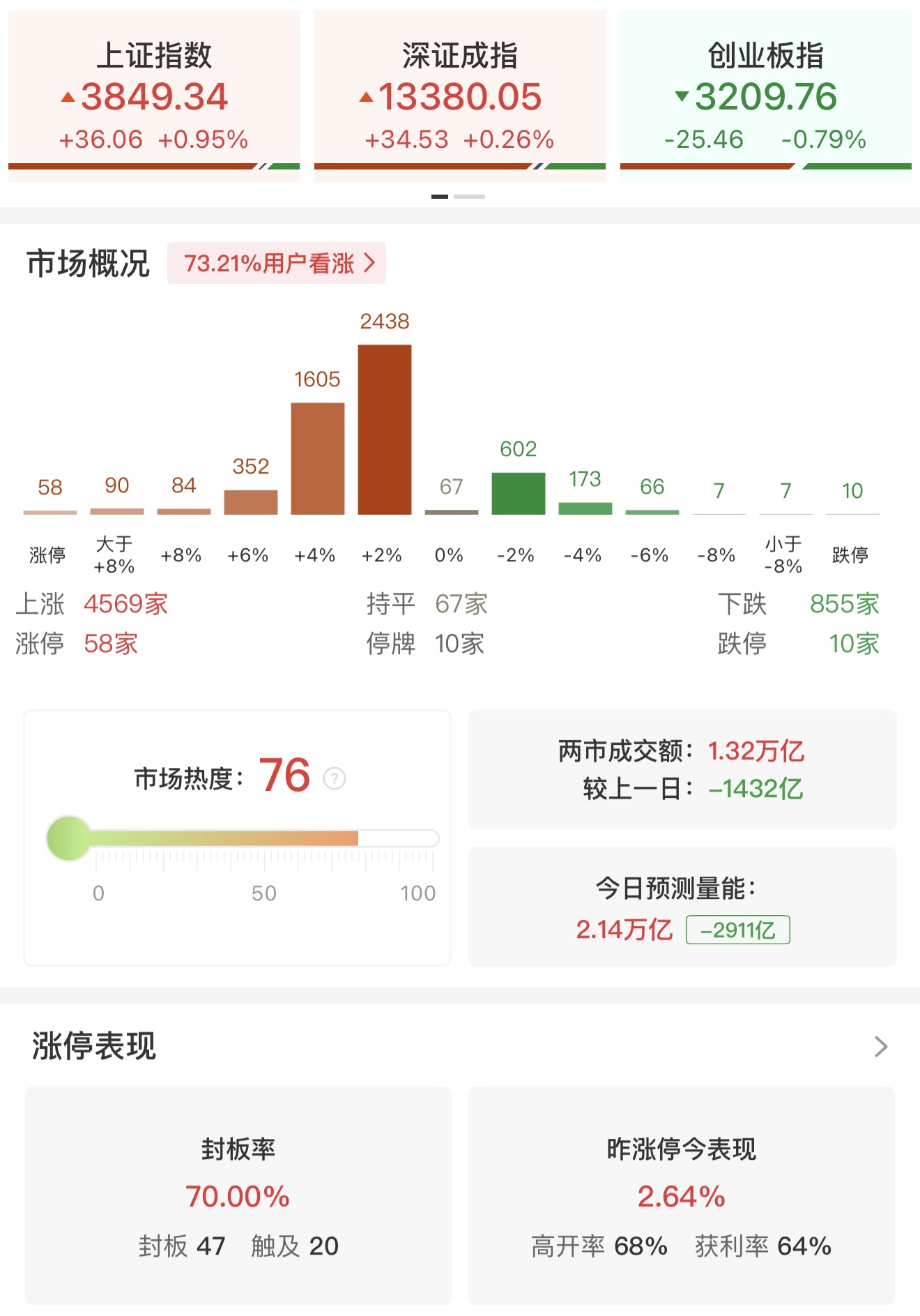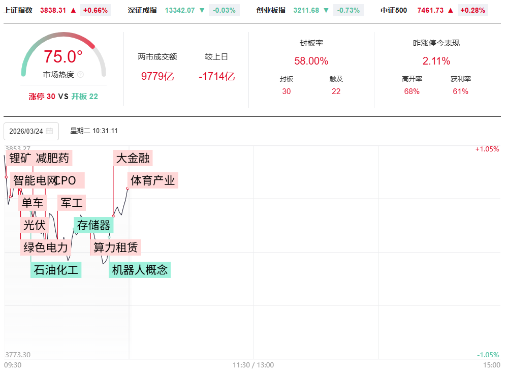 财联社3月24日电,市场早盘探底回升,沪指盘中涨超1%,创业板指跌幅收窄,黄白线分化明显,中小盘股走势较强,微盘股指数涨超2%。沪深两市半日成交额1.32万亿,较上个交易日缩量1432亿。全市场超4500只个股上涨。从板块来看,绿电概念持续走强,华电辽能7连板,韶能股份5天4板,辽宁能源2连板,迪森股份20CM涨停。军工板块走强,长城军工、湖南天雁、建设工业涨停。航运板块震荡拉升,招商南油涨停。算力芯片概念反弹,沐曦股份涨超15%,摩尔线程涨超9%。下跌方面,存储芯片概念震荡回落,普冉股份跌超9%。截至收盘,沪指涨0.95%,深成指涨0.26%,创业板指跌0.79%。