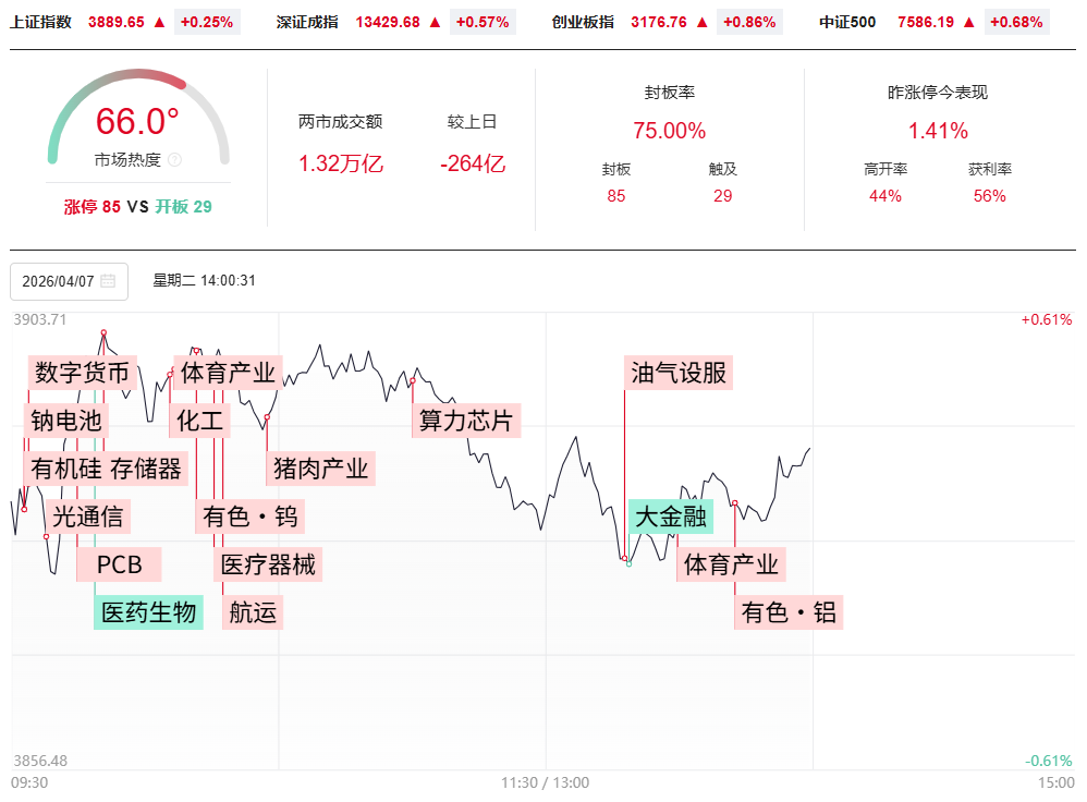 财联社4月7日电,三大指数均冲高回落,创业板指翻绿,此前一度涨逾1%,科创50指数涨超1.5%。黄白线分化明显,微盘股走势较强,微盘股指数涨超2%。沪深两市半日成交额1.07万亿,较上个交易日放量10亿。盘面上热点快速轮动,化工板块持续走高,十余只成分股涨停,大炼化、有机硅等方向领涨,齐翔腾达4天2板,江南高纤、合盛硅业、三房巷涨停。PCB概念震荡拉升,同宇新材、宏昌电子双双涨停。算力芯片概念盘中持续反弹,寒武纪涨超10%。下跌方面,保险板块集体下挫,中国太保、中国人寿震荡回落。创新药概念多股走弱,联环药业、莱美药业大跌。截至收盘,沪指涨0.03%,深成指跌0.2%,创业板指跌0.46%。