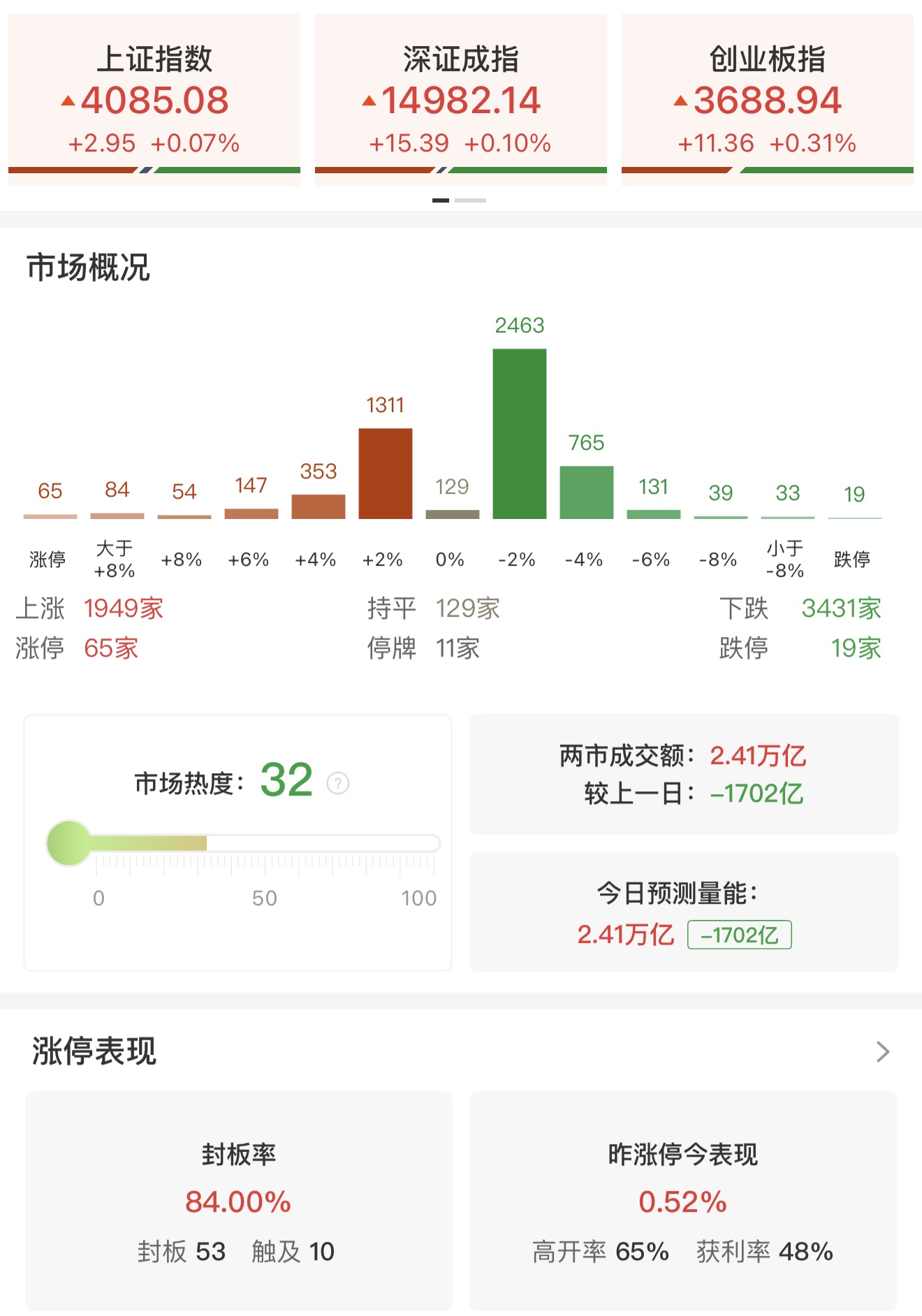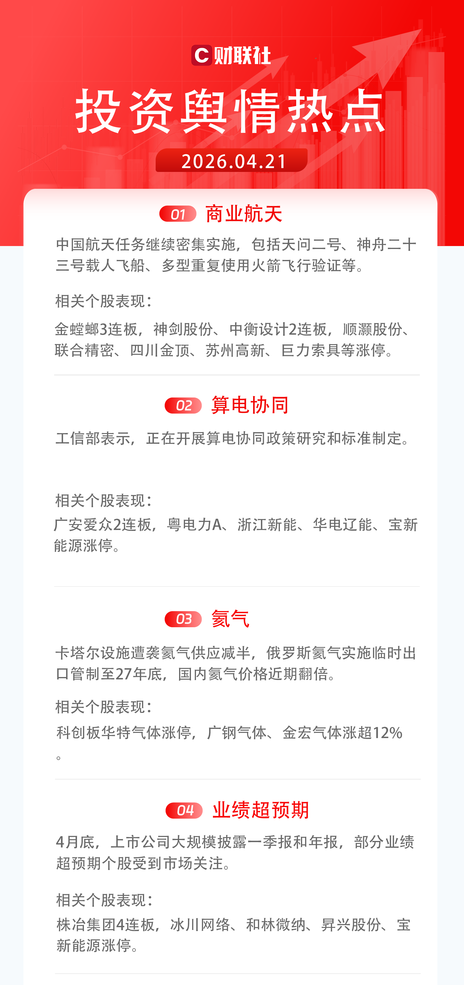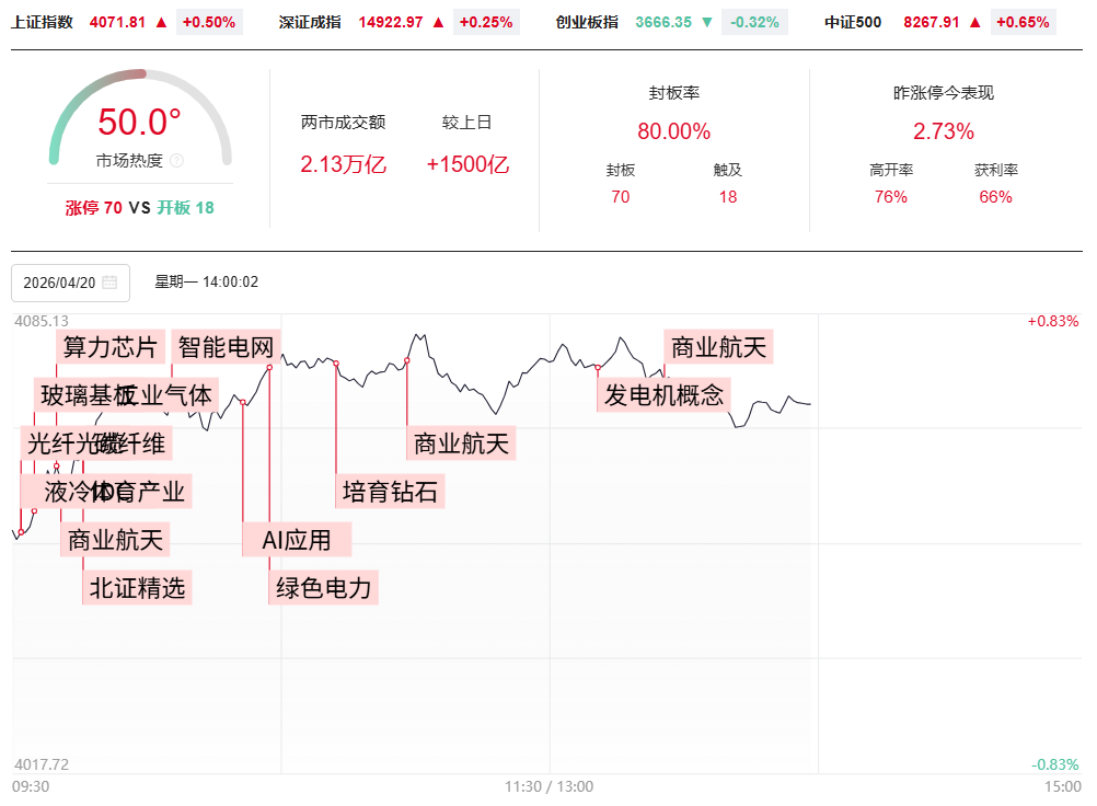 财联社4月20日电,市场早盘震荡拉升,沪指、深成指均涨超0.5%,创业板指再度翻红,北证50指数盘中超3%。沪深两市半日成交额1.71万亿,较上个交易日放量1254亿。盘面上热点快速轮动,全市场超3300只个股上涨。从板块来看,商业航天概念表现活跃,中国卫星、西部材料、中衡设计、有研复材涨停。光纤概念快速拉升,通鼎互联3天2板,中天科技涨停。液冷服务器概念走强,英维克触及涨停,创历史新高,康盛股份7天4板。玻璃基板概念延续强势,沃格光电走出8天5板,续创历史新高,彩虹股份2连板。下跌方面,医药板块走势较弱,科拓生物、恩华药业、海森药业等纷纷下挫。截至收盘,沪指涨0.67%,深成指涨0.6%,创业板指涨0.04%。
