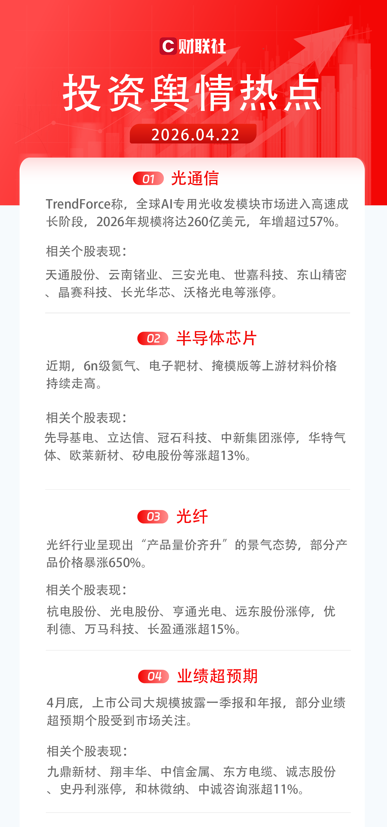 财联社4月21日电,午后CPO概念震荡回升,东山精密触及涨停,续创历史新高,此前致尚科技20cm涨停,仕佳光子、英唐智控、华盛昌、蘅东光、腾景科技跟涨。消息面上,根据TrendForce集邦咨询最新研究,全球AI专用光收发模块市场进入高速成长阶段,预估市场规模将从2025年165亿美元,一举扩大至2026年260亿美元,年增超过57%。