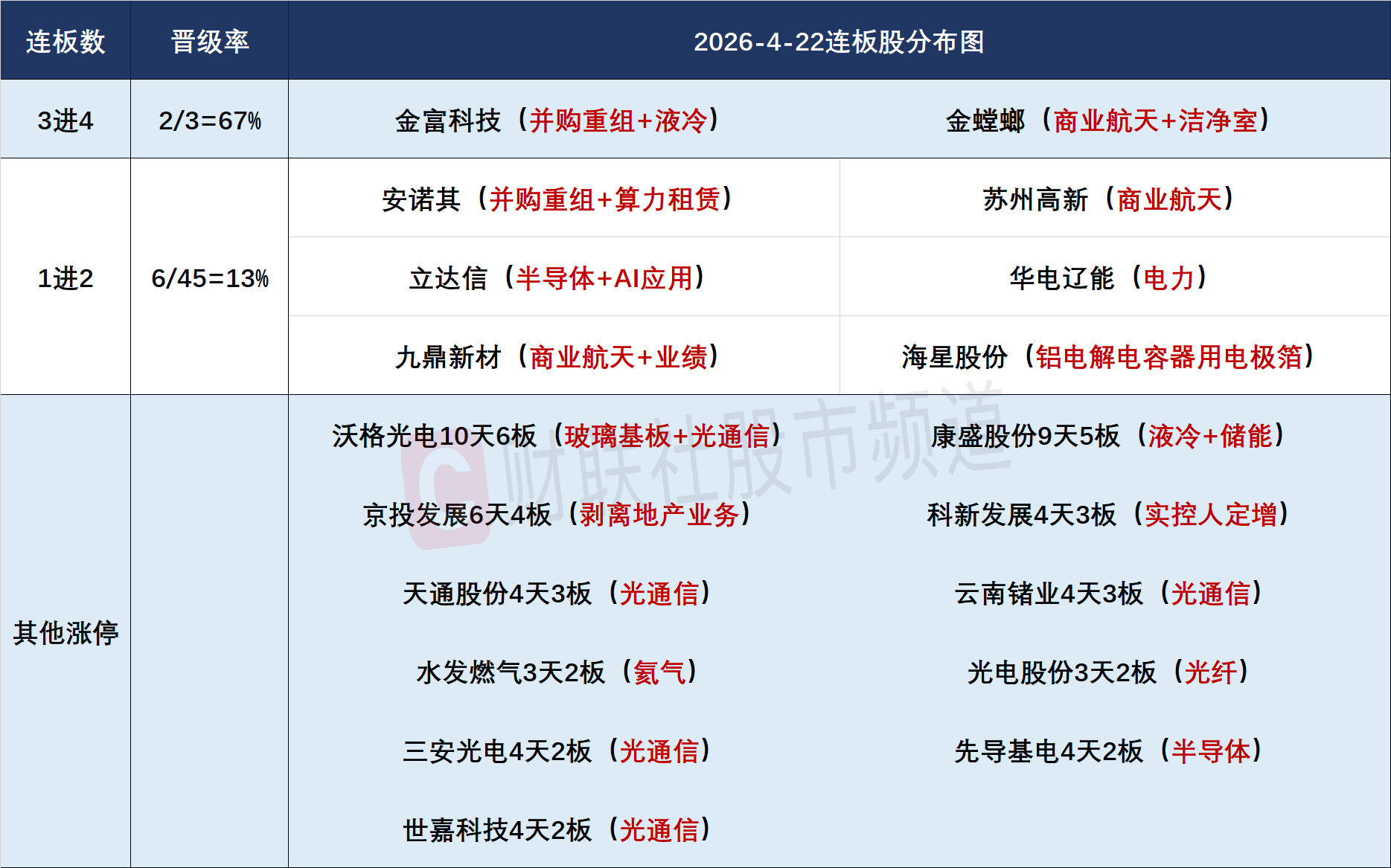 4月21日连板股分析:连板股晋级率不足三成 商业航天延续强势
