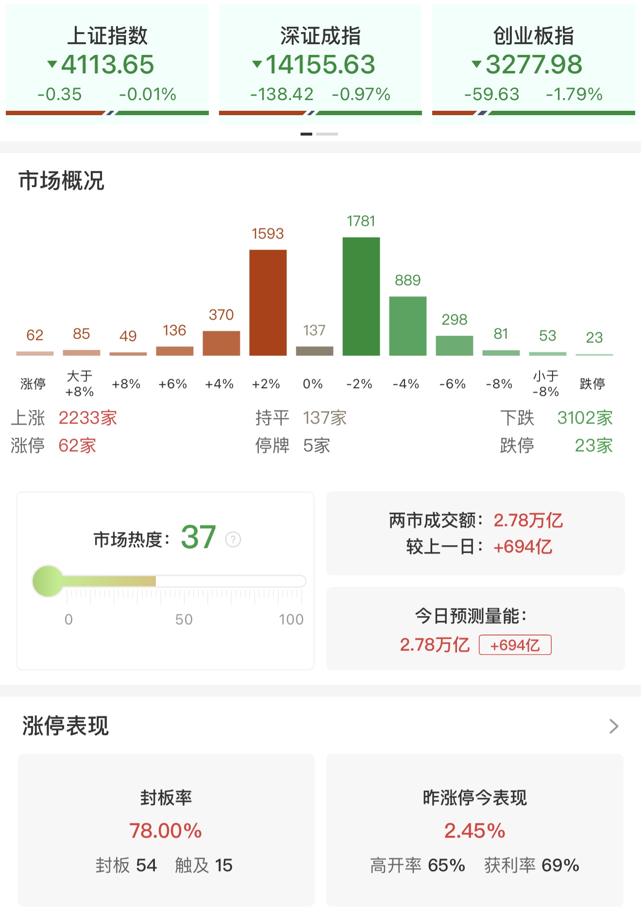 财联社1月20日电,早盘三大指数震荡回落,深成指跌超1%,创业板指一度跌超2%。沪深两市半日成交额1.85万亿,较上个交易日放量568亿。盘面上热点较为杂乱,全市场超3300只个股下跌。从板块来看,化工板块逆势拉升,红宝丽、山东赫达、宏柏新材、维远股份、红墙股份涨停。房地产板块表现活跃,大悦城、我爱我家、城投控股涨停。AI应用端盘中走高,佳云科技、粤传媒、浙文互联、天地在线涨停。存储芯片概念反复活跃,普冉股份、佰维存储再创新高。下跌方面,商业航天概念再度大跌,华菱线缆、航天动力跌停。截至收盘,沪指跌0.3%,深成指跌1.22%,创业板指跌1.83%。