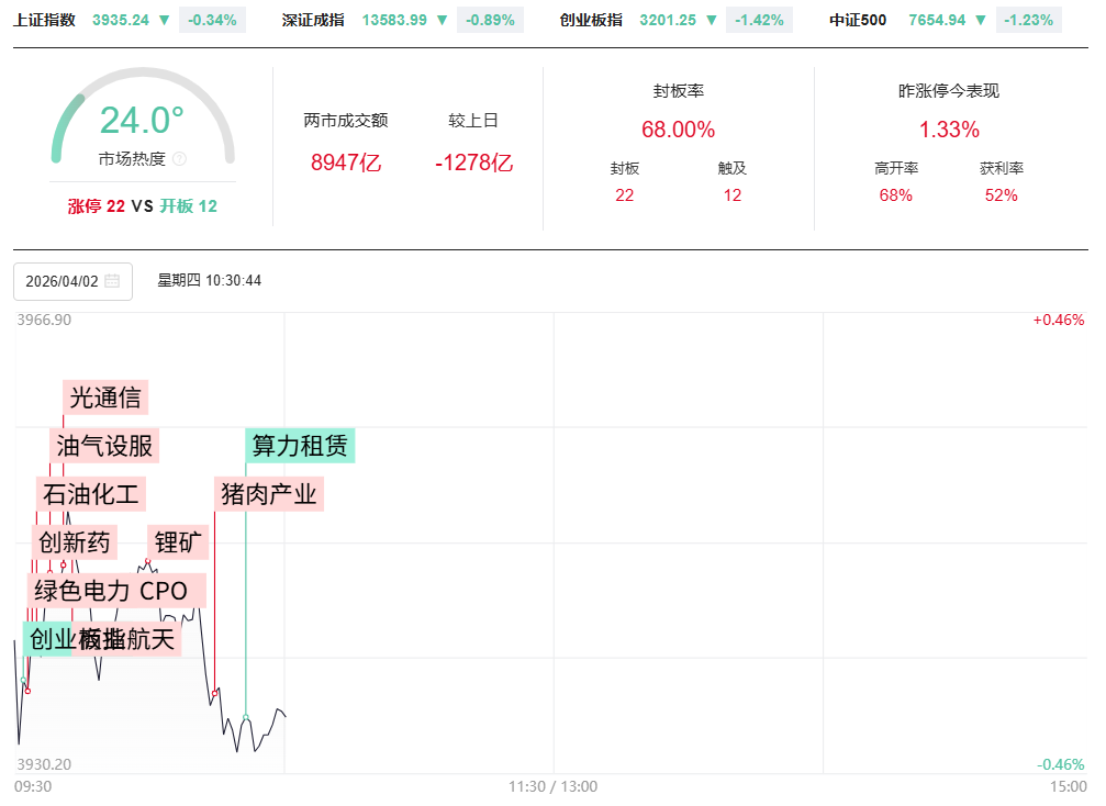 财联社4月2日电,市场焦点股大胜达(11天6板)高开3.54%,算力租赁概念股奥瑞德(11天6板)平开,医药板块津药药业(4板)竞价涨停、凯莱英(2板)高开1.80%,参股智谱的九安医疗(4天3板)高开1.93%,光通信概念股铭普光磁(6天3板)高开0.07%,引入战略投资者的星辉环材(创业板2板)高开13.16%,业绩超预期的通达股份(2板)高开9.44%,电力股新中港(2板)高开4.93%,地产股宁波富达(3天2板)高开1.35%,光伏板块国晟科技(3天2板)高开1.78%。