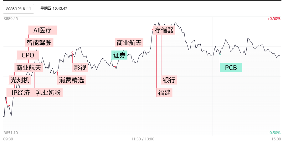 财联社12月19日电,上个交易日三大指数涨跌不一,沪指低开回升,创业板指低开低走跌超2%。全市场近2900只个股上涨。沪深两市成交额1.66万亿,较前日缩量1557亿。1)随着近期可复用火箭密集发射,商业航天概念结束调整卷土重来,10厘米抱团人气股顺灏股份、西部材料反包涨停,天银机电、西测测试、中国卫星等此前滞涨的趋势抱团股迎来批量加速创出历史或阶段新高。不过作为板块人气风向标的几只航天系个股整体表现仍不问不火,且不少补涨品种午后悉数出现炸板动作。2)12月17日,《学习时报》发表文章《何为“犒赏经济”》,文章指出,一种被称为“犒赏经济”的新型消费模式在年轻群体中悄然兴起并迅速发展,成为拉动内需、扩大消费的新引擎。IP经济早盘率先走强,带动AI玩具、影视、首发经济等悦己消费概念轮动拉升,德艺文创、广博股份、三湘印象、博纳影业等多股涨停。而零售股百大集团、南京商旅、利群股份实现连板晋级,带动新世界、上海九百等低位补涨股上板。3)12月16日消息,蚂蚁集团旗下AI健康应用“蚂蚁阿福”冲上苹果应用榜总榜第三位,AI医疗概念热度不减,美年健康录得2连板,嘉和美康、华人健康双双录得20厘米涨停,此外间接受益医疗信息化深化的医药商业概念同样表现不俗,叠加福建板块的鹭燕医药一字涨停晋级2连板,漱玉平民、英特集团、重药控股等多股涨停。4)2025年12月,谷歌在亚洲密集开展供应链审厂工作,计划在2026年初敲定液冷设备及TPU芯片供应链体系。谷歌链仍局部活跃,液冷服务器方向飞龙股份一度晋级2连板,禾望电气、英维克盘中一度大幅冲高,同时受益光纤涨价的空芯光纤概念长飞光纤和交换机概念股瑞斯康达双双涨停。