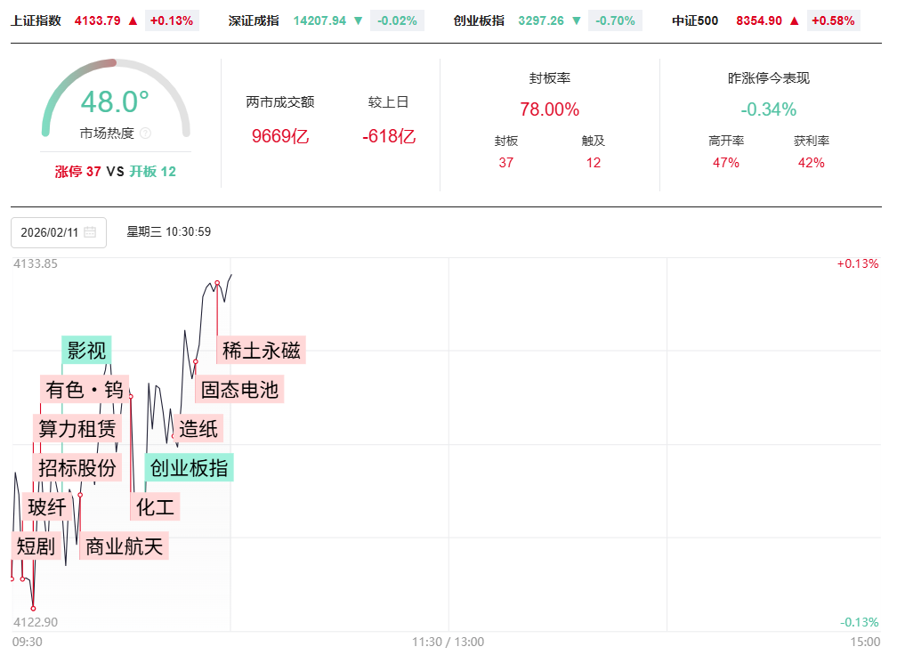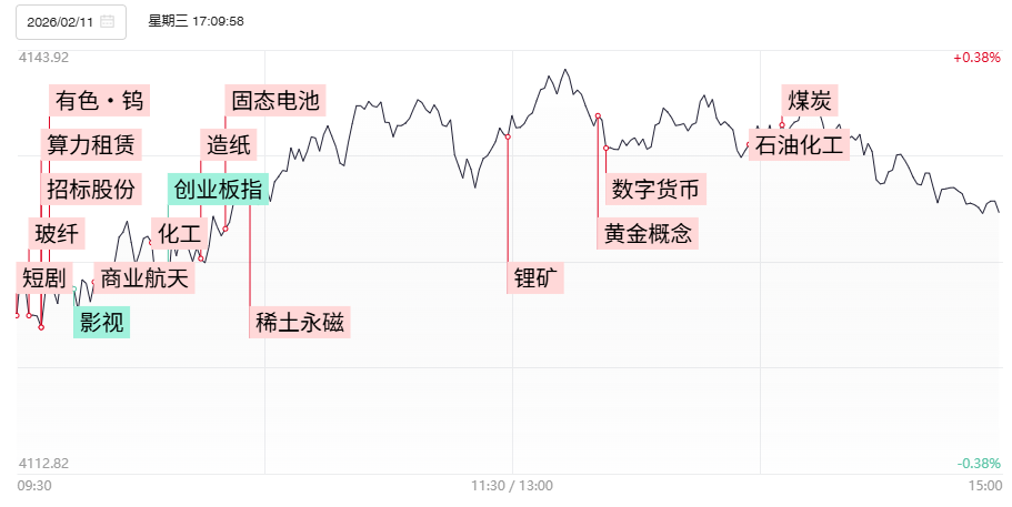 财联社2月11日电,三大指数涨跌不一,沪指震荡拉升,创业板指走势较弱。沪深两市半日成交额1.3万亿,较上个交易日缩量949亿。全市场超2700只个股上涨。从板块来看,化工板块近期反复走强,吉华集团5天4板,三房巷、百川股份、醋化股份、华尔泰涨停。玻纤概念快速拉升,山东玻纤、国际复材、中国巨石涨停。有色金属板块表现活跃,有色·钨概念领涨,翔鹭钨业4天2板,章源钨业涨停。算力租赁概念拉升,南兴股份、大位科技涨停。下跌方面,影视院线概念遭重挫,横店影视跌停,华谊兄弟、华策影视、中国电影大跌。截至收盘,沪指涨0.22%,深成指跌0.07%,创业板指跌0.91%。