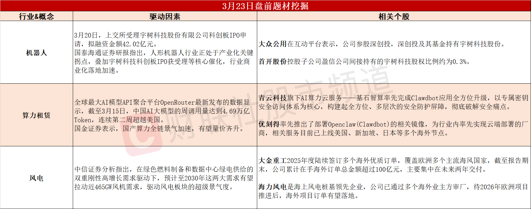①上交所受理宇树科技IPO申请,机器人产业化进程全面提速。②中国AI大模型调用量领跑全球,国产算力全链景气加速。③绿色燃料制备+数据中心绿电驱动,风电板块景气有望延续。