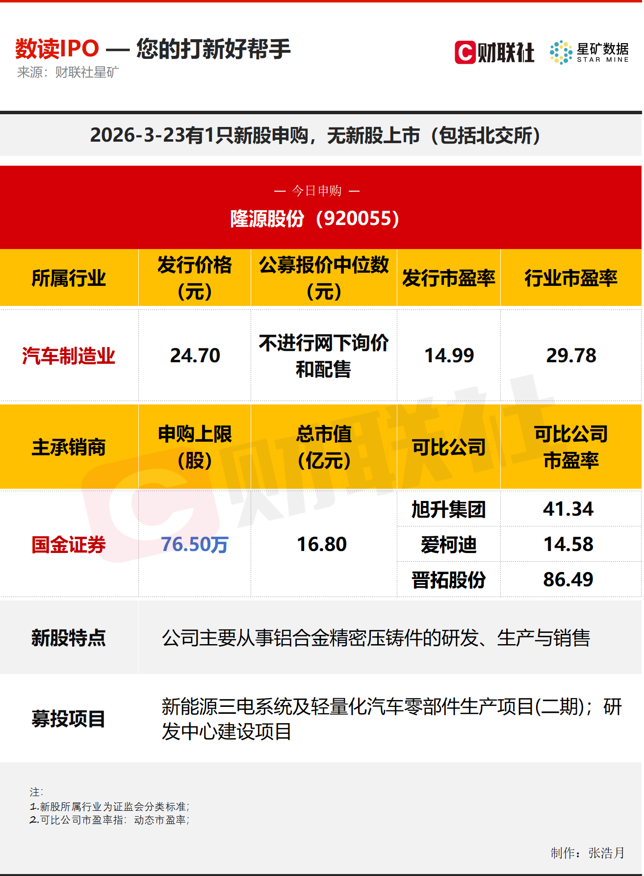 财联社3月23日电,今日有1只新股申购,为北交所的隆源股份;无新股上市。隆源股份主要从事铝合金精密压铸件的研发、生产与销售。