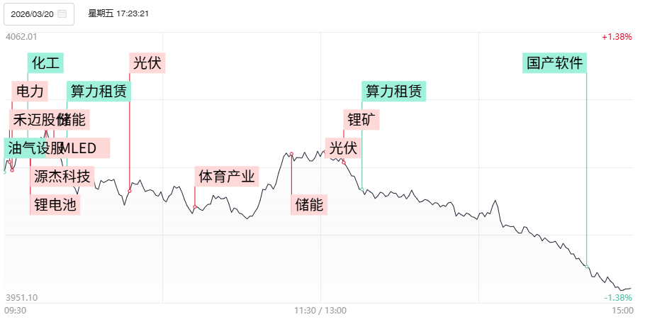 财联社3月23日电,上个交易日市场全天冲高回落,沪指震荡调整失守半年线,跌破4000点整数关口,创业板指盘中刷新年内新高后快速回落。黄白二线分化明显,中小盘股普跌,微盘股指数跌超3%。全市场连续两日超4700只个股下跌。沪深两市成交额2.29万亿,放量1759亿。1)随着中东局势冲突加剧,天然气等能源生产设施成为各方的攻击目标,上游气价上涨向电价传导预期强化,储能产业链持续站上风口,逆变器方向涨势火爆,上能电气、首航新能封涨停,锦浪科技、昱能科技、德业股份等涨幅靠前。此外受益储能电池需求排产双旺,电池产业链也迎来强力补涨,石大胜华、璞泰来、赣锋锂业触及涨停,华宝新能、鹏辉能源双双涨超10%。2)财联社记者从消息人士获悉,此前马斯克旗下Space X团队向国内某头部异质结设备厂采购设备预计将于5月第一周发货。光伏产业链午后大面积冲高,却日内持续震荡回落,捷佳伟创、钧达股份触及涨停后涨幅显著收窄,迈为股份、拉普拉斯、奥特维等多只光伏设备股也悉数收出带长上影日K线。3)绿电产业链延续此前强势,华电辽能、韶能股份、华电能源实现连板晋级,九洲集团一度触及20厘米涨停,粤电力A、协鑫能科盘中一度冲高逼近涨停。4)在2026OFC大会上,光通信行业龙头Lumentum预计到2026财年底,EML产能将较2025年增长超50%。CPO概念早盘再度大面积冲高,光芯片概念云南锗业早早封死涨停,源杰科技一度触及20厘米涨停,总市值逼近1000亿,长光华芯、新易盛刷新历史高点。
