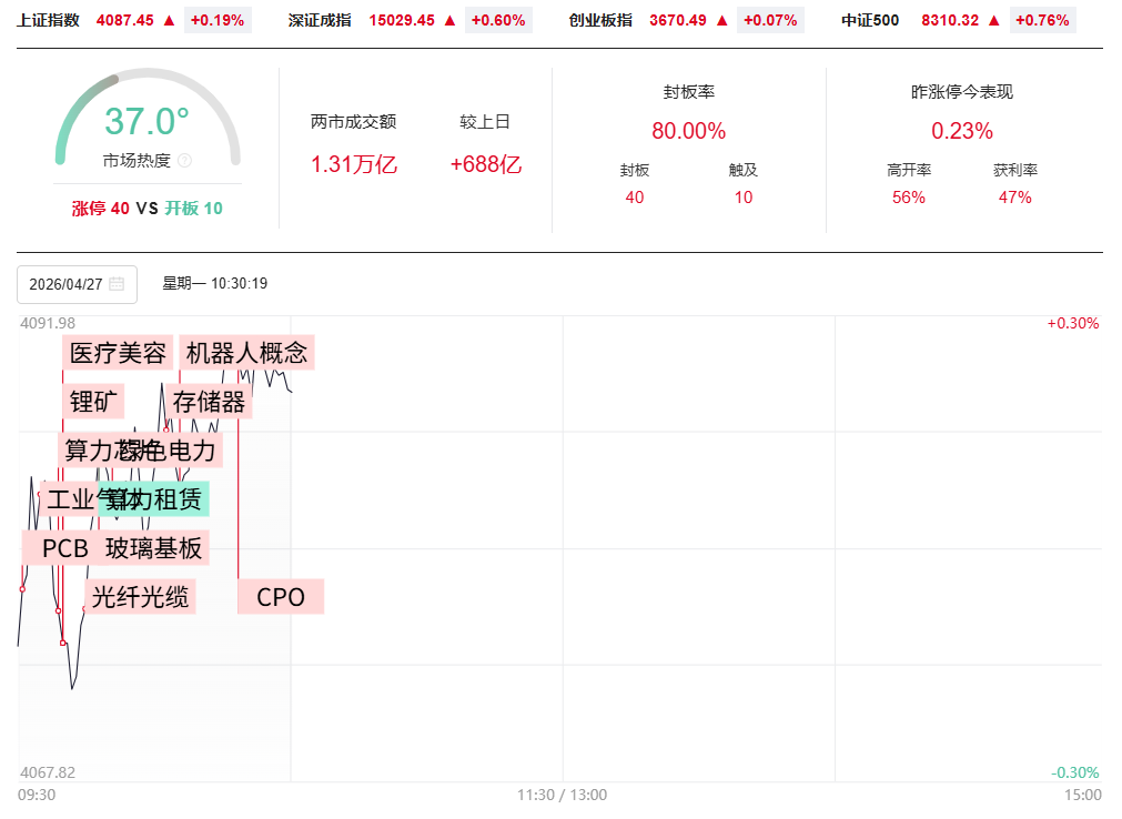 财联社4月27日电,早盘玻璃基板概念再度走强,沃格光电反包涨停,走出13天7板,德龙激光、阿石创、通富微电、凯格精机、五方光电跟涨。消息面上,日前台积电在公司2026Q1业绩说明会上表示,公司正在搭建CoPoS先进封装技术的试点产线,预估几年后可进入量产阶段。此前三星电机已正式向苹果提供了用于半导体封装的玻璃基板样品。