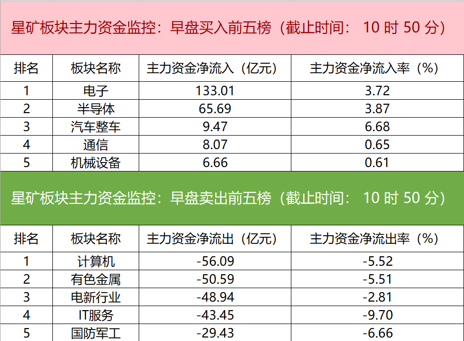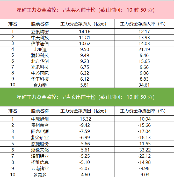 财联社4月27日电,财联社星矿数据显示,今日早盘主力资金净流入电子、半导体、汽车整车等板块,净流出计算机、有色金属、电新行业等板块,其中电子板块净流入超133亿元。个股方面,立讯精密大涨,主力资金净买入超14.16亿元位居首位,中天科技、信维通信、比亚迪获主力资金净流入居前;中际旭创遭净卖出超15亿元,贵州茅台、阳光电源、紫金矿业资金净流出额居前。