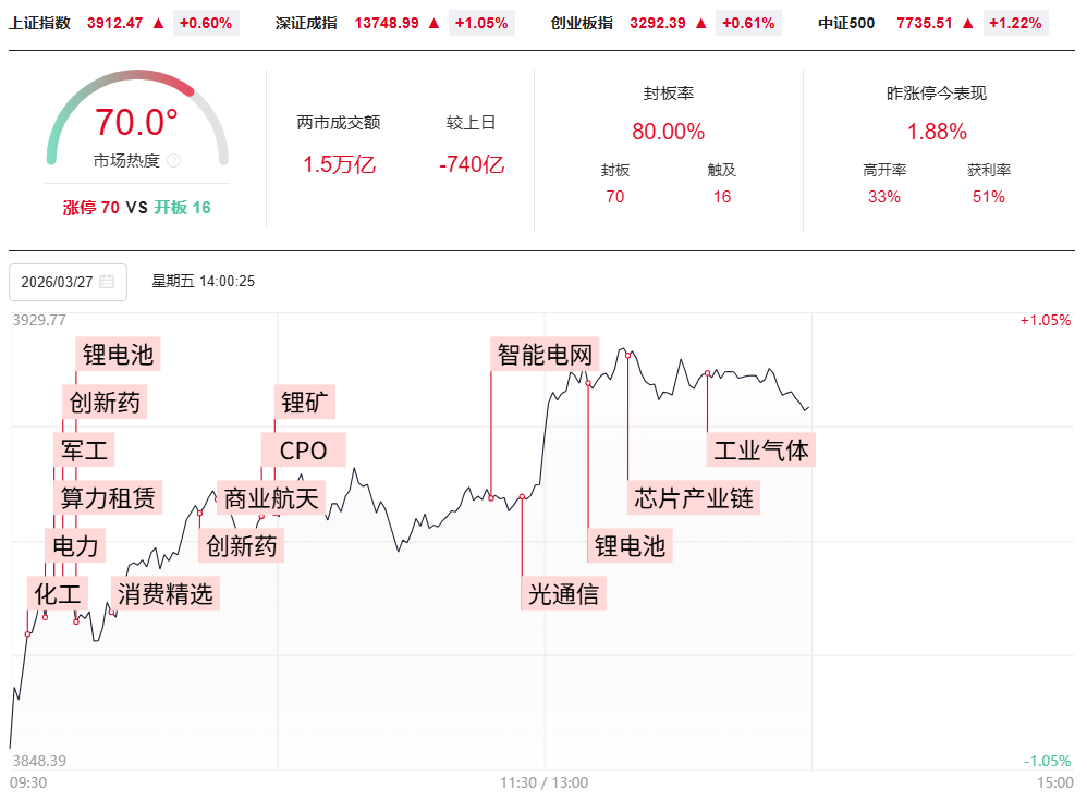 财联社3月27日电,指数走强,创业板指拉升涨逾1.00%,沪指涨0.34%,深成指涨1.12%。锂电、医药、化工、有色等方向涨幅居前,沪深京三市上涨个股近3900只。