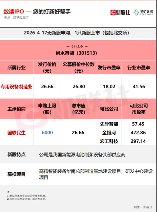 财联社4月17日电,今日无新股申购;有1只新股上市,为创业板的尚水智能。尚水智能是我国新能源电池制浆设备头部供应商。