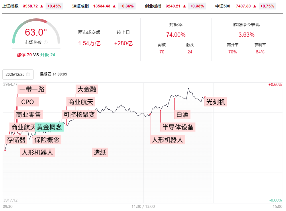 财联社12月25日电,市场早盘走势分化,三大指数涨跌不一,沪指震荡拉升,创业板指冲高回落。沪深两市半日成交额1.2万亿,较上个交易日放量509亿。盘面上热点快速轮动,全市场超3200只个股上涨。从板块来看,商业航天概念反复活跃,神剑股份晋级6连板,九鼎新材3连板,隆基机械等十余股涨停。机器人概念走强,万向钱潮、旭升集团等多股涨停。造纸概念爆发,博汇纸业、宜宾纸业、五洲特纸涨停。数字货币概念拉升,证通电子、金时科技涨停。下跌方面,贵金属概念跌幅居前,浩通科技跌超8%。海南自贸概念下挫,海南瑞泽、凯撒旅业走弱。截至收盘,沪指涨0.29%,深成指跌0.11%,创业板指跌0.37%。