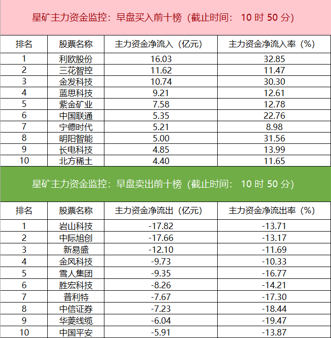财联社1月9日电,财联社星矿数据显示,今日早盘主力资金净流入有色金属、文化传媒、小金属等板块,净流出电子、半导体、通信等板块,其中电子板块净流出超59亿元。个股方面,利欧股份涨停,主力资金净买入超16.03亿元位居首位,三花智控、金发科技、蓝思科技获主力资金净流入居前;岩山科技遭净卖出超17亿元,中际旭创、新易盛、金风科技资金净流出额居前。