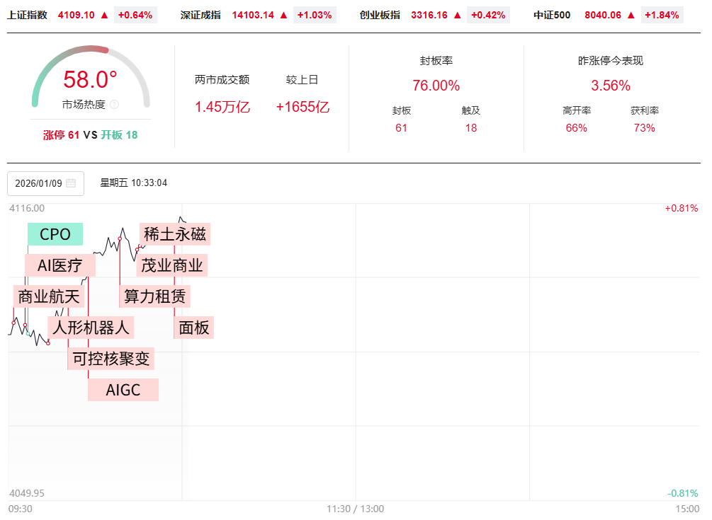 财联社1月9日电,指数走强,深成指拉升涨逾1.00%,沪指涨0.70%,创业板指涨0.24%,北证50指数涨超2%。AI应用、商业航天、军工、创投等方向涨幅居前,沪深京三市上涨个股近3700只。