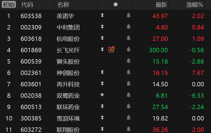 财联社3月31日电,市场焦点股美诺华(12天7板)高开2.02%,光纤概念股中利集团(7天5板)高开0.84%、杭电股份(4天3板)高开1.09%、长飞光纤(5天3板)低开0.56%,并购重组的狮头股份(5天4板)低开2.88%,商业航天概念股神剑股份(3板)高开7.67%、再升科技(4天3板)平开,医药板块双鹭药业(4天3板)低开6.33%、联环药业(2板)低开2.24%,重整的雪浪环境(创业板6天3板)平开,机器人概念股联翔股份(6天3板)高开2.00%。