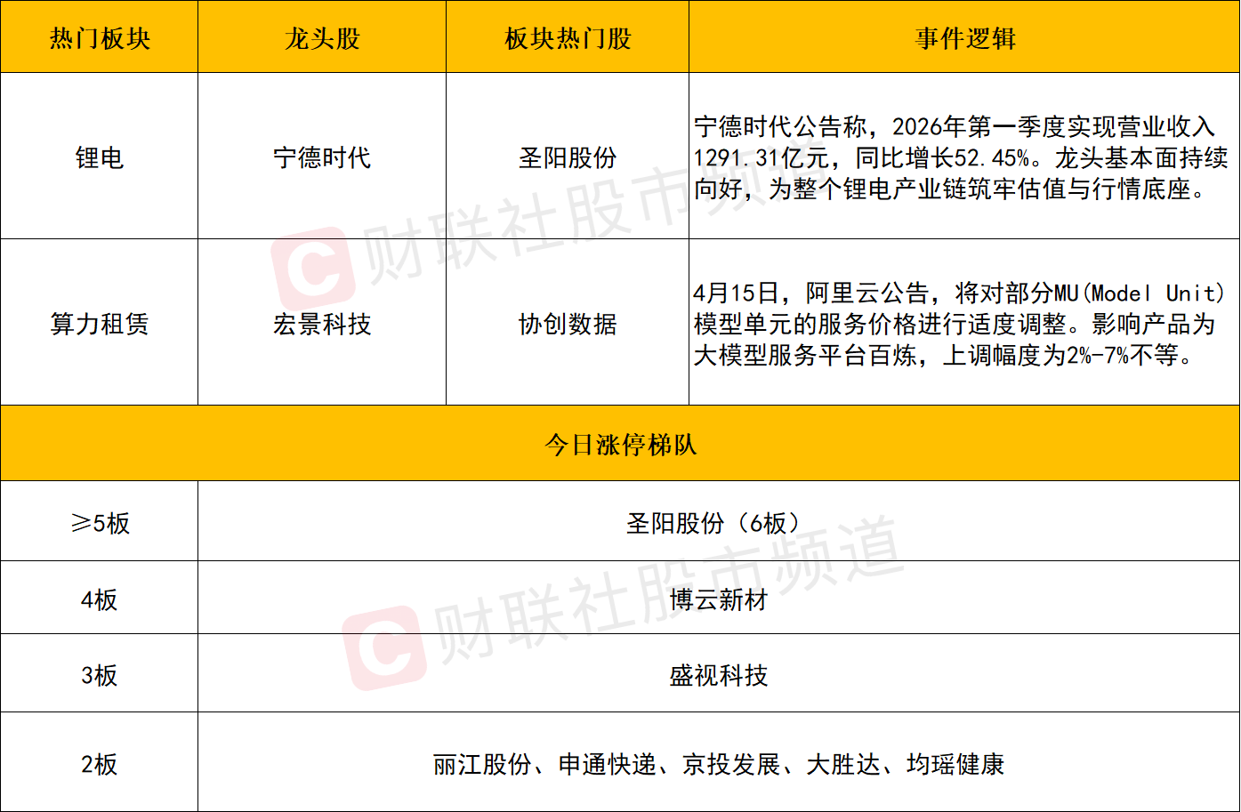 今日市场还是呈现结构性分化,热点围绕着锂电与算力链展开。宁德时代受一季度业绩高增催化涨超5%,续创新高的同时总市值反超中国石油跃居A股第三,此外像圣阳股份晋级6连板,大中矿业4天2板、天华新能自公布一季报后6个交易日涨超50%。算力租赁方向全线爆发,宏景科技20CM涨停续创新高,协创数据3天涨超50%。算力硬件方向同样反弹,特发信息、通鼎互联等涨停,昨日调整的新易盛与天孚通信今日双双放量修复,中际旭创也于盘中刷新新高。目前市场主流风格还是以景气驱动下的趋势炒作为主,后续仍可在短线震荡过程中寻找低吸机会。