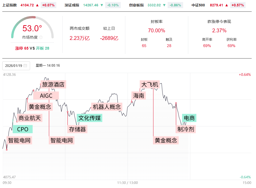 财联社1月19日电,三大指数涨跌不一,沪指走势较强,创业板指冲高回落。沪深两市成交额2.71万亿,较上一个交易日缩量3179亿。盘面上,全市场超3500只个股上涨。从板块来看,电网设备概念爆发,十余只成分股涨停,保变电气、中国西电、广电电气涨停。机器人概念震荡拉升,五洲新春、日盈电子涨停。贵金属板块涨幅居前,四川黄金、招金黄金涨停。旅游酒店概念走强,大连圣亚、九华旅游涨停。商业航天概念局部活跃,九鼎新材、越秀资本涨停,超捷股份涨超15%。下跌方面,CPO概念震荡下挫,剑桥科技跌停,腾景科技、光迅科技下挫。截至收盘,沪指涨0.29%,深成指涨0.09%,创业板指跌0.7%。