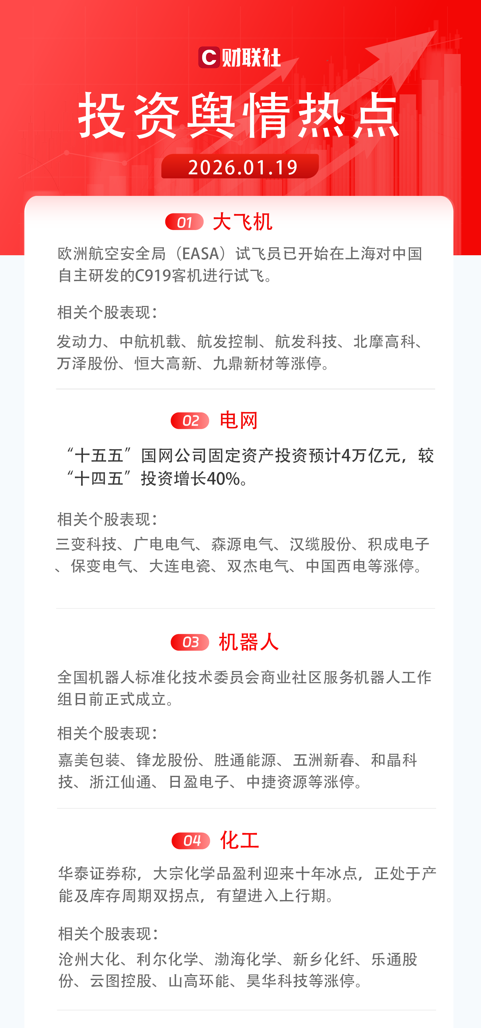 财联社1月19日电,午后大飞机概念震荡走强,航发控制、中航机载涨停,此前北摩高科、航发科技涨停,航亚科技涨超10%,航发动力、中航西飞、中航沈飞等跟涨。消息面上,长江证券研报称,十五五期间国产商用大飞机批产节奏及商用航空发动机自主可控均有望加速,成为军工航空板块重要的增长动力来源,航空板块相关典型个股有望实现价值重估。
