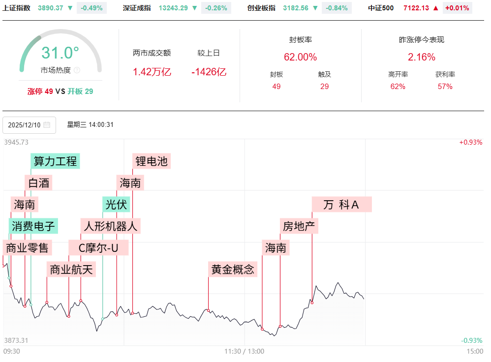 财联社12月10日电,市场早盘震荡调整,沪指低开低走,创业板指跌超1%。量能再度萎缩,沪深两市半日成交额1.14万亿,较上个交易日缩量1184亿。全市场超3800只个股下跌。从板块来看,海南板块走强,罗牛山、海南瑞泽涨停。零售概念表现活跃,永辉超市、南京商旅双双3连板。商业航天板块局部强势,再升科技3连板,天通股份2连板。多只福建人气股下挫,海欣食品触及跌停,招标股份、红相股份大跌。板块方面,海南、贵金属、零售、影视院线等板块涨幅居前,培育钻石、光伏等板块跌幅居前。截至收盘,沪指跌0.72%,深成指跌0.56%,创业板指跌1.23%。