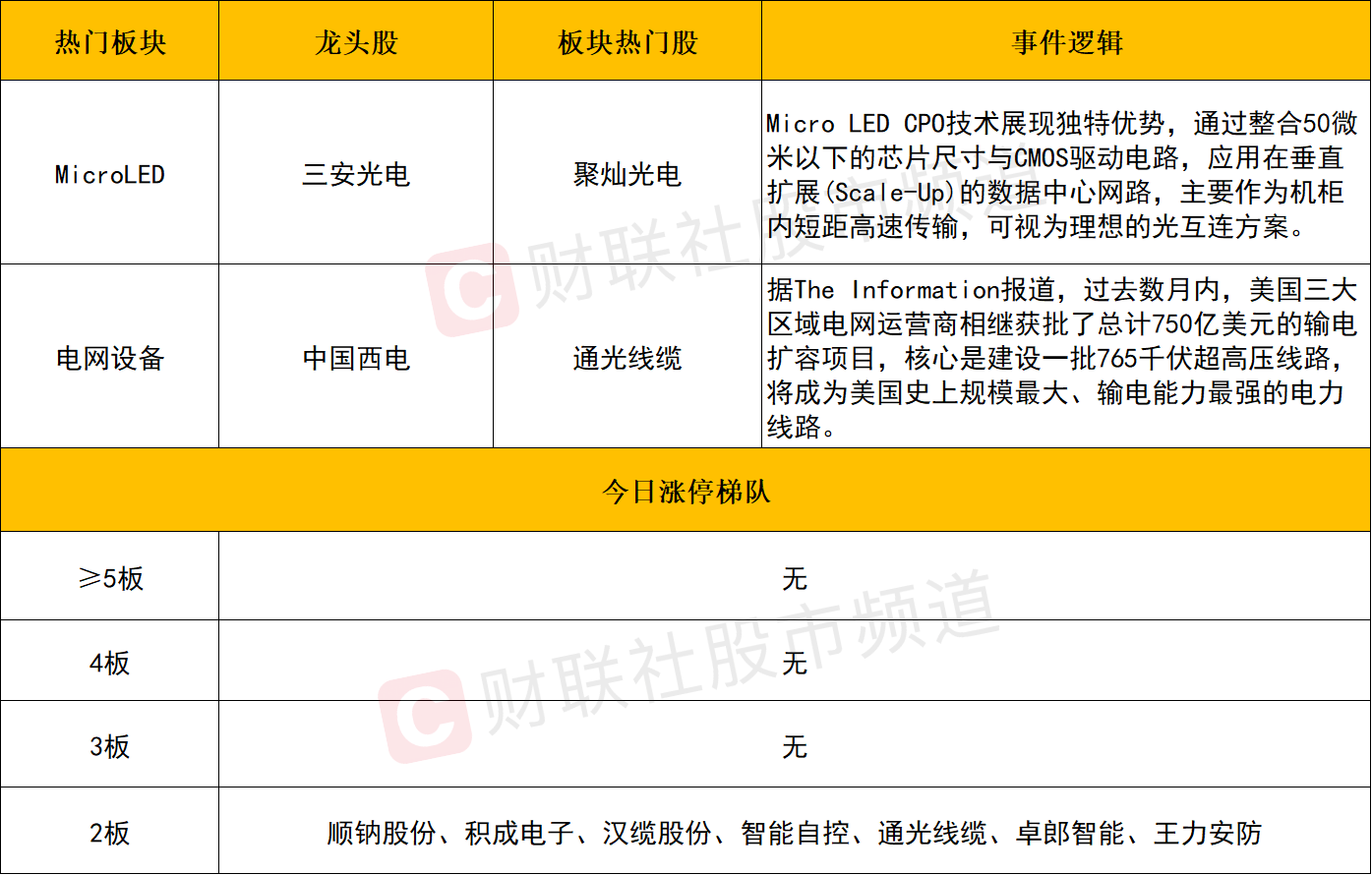 今日共69股涨停,连板股总数7只,其中三连板及以上个股0只,上一交易日共6只连板股,连板股晋级率0%(不含ST股、退市股)。个股方面,市场迎来反弹,全市场近4100只个股上涨,但午后市场回落,炸板率快速上升,此外,两市成交额仅较上一个交易日放量243亿。连板股方面,随着午后山东墨龙、洲际油气双双炸板,市场连板高度仅剩2板,上一次出现这种情况还是在23年7月24日。板块方面,北美缺电逻辑持续演绎,电网设备、燃气轮机板块强者恒强,汉缆股份走出10天6板,通光线缆20CM2连板,中国西电涨停创历史新高;MicroLED概念爆发,近三十只概念股涨停或涨超10%,其中华灿光电20CM一字涨停,权重三安光电涨停,龙腾光电、聚灿光电、聚飞光电等9只个股20CM涨停,消息面上,根据TrendForce最新调查,Micro LED CPO方案大幅降低整体能耗至铜缆方案的5%,有望凭节能优势成为光互连替代方案。